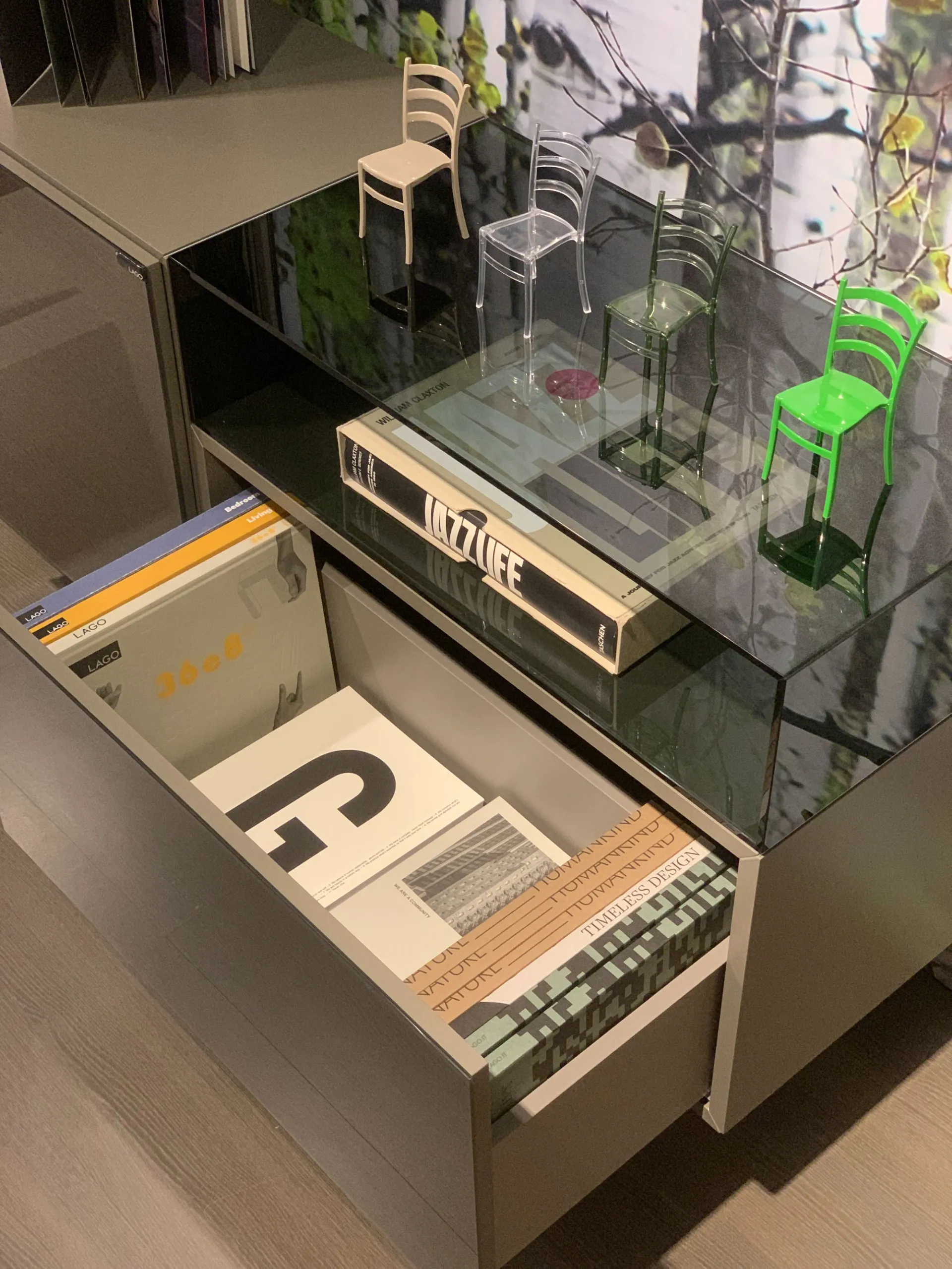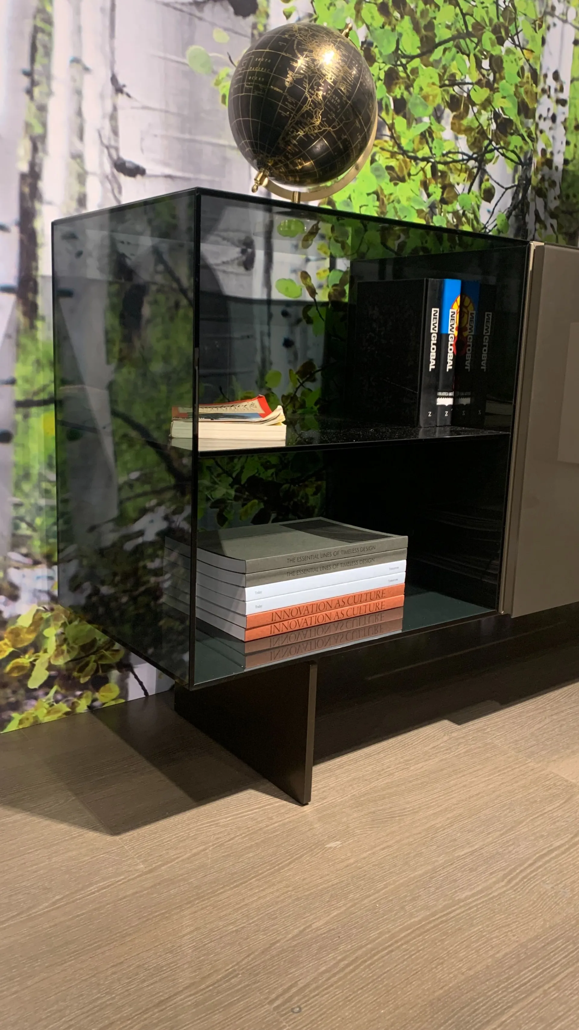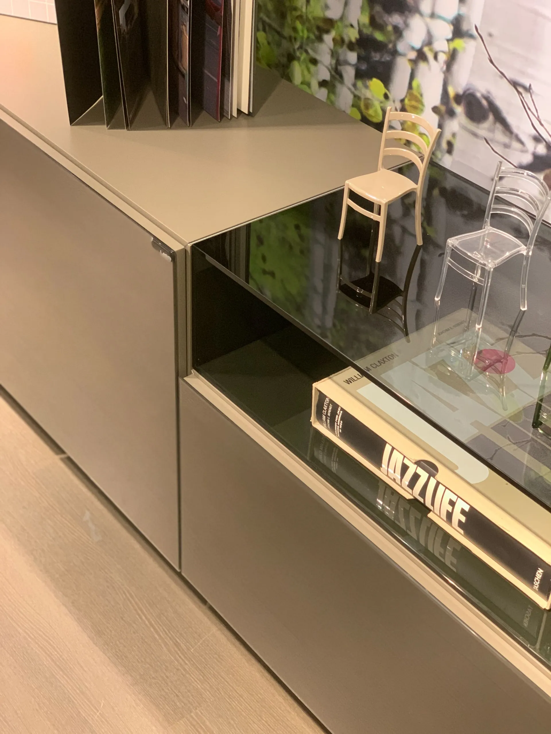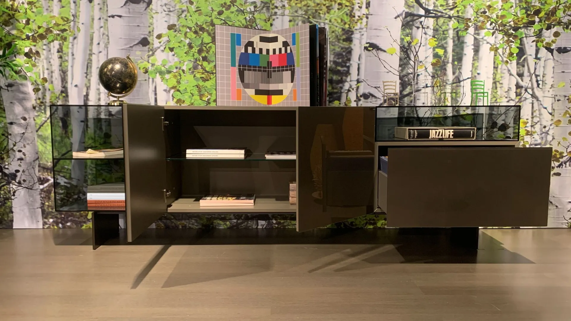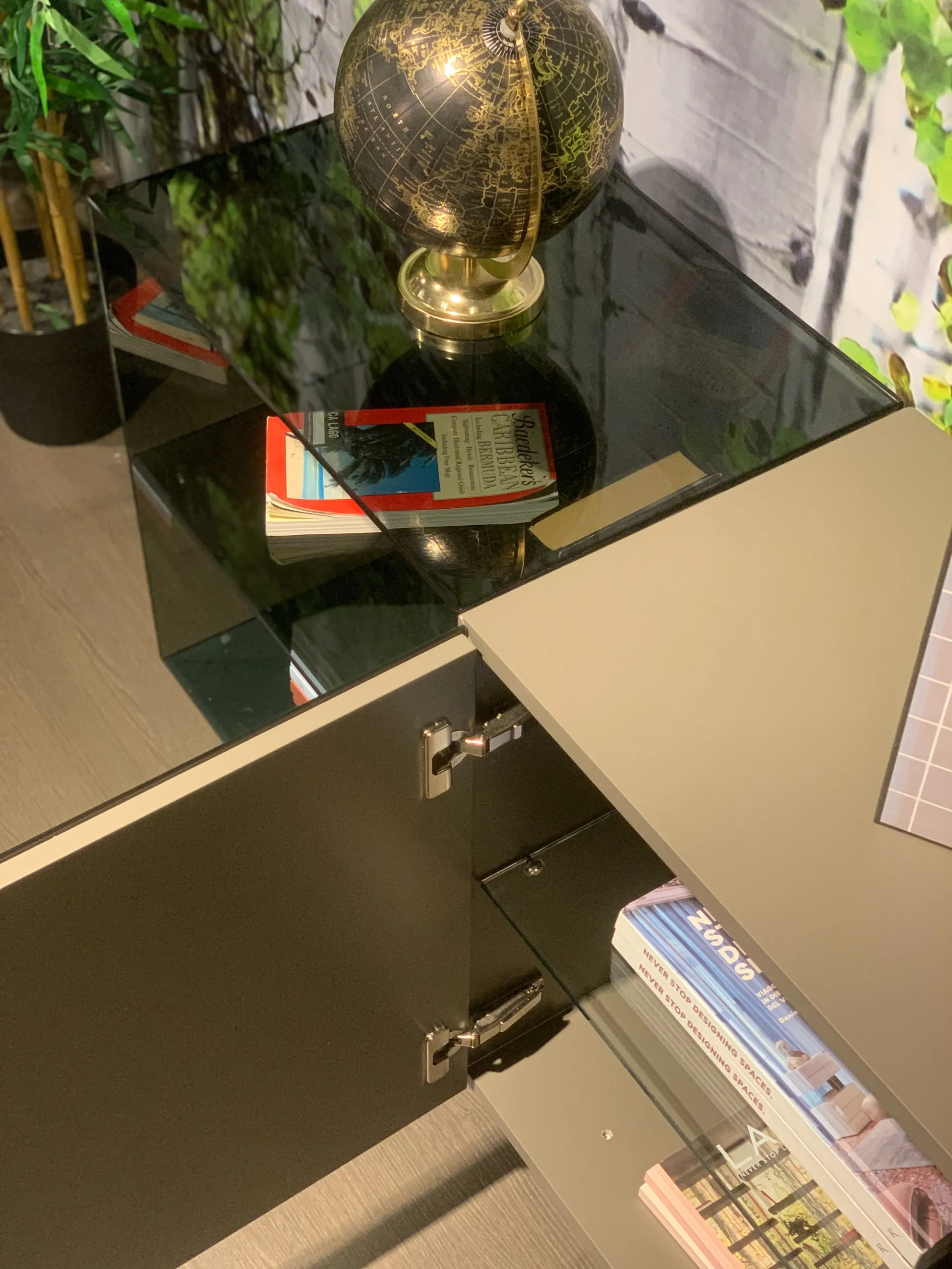 FINITURA: Struttura in laccato opaco Havana e vetro fumè grigio, frontali in vetro lucido Piombo Metal, costruzione a 45°. Gambe in metallo Peltro Steel. Pannello bifacciale laccato opaco Havana.