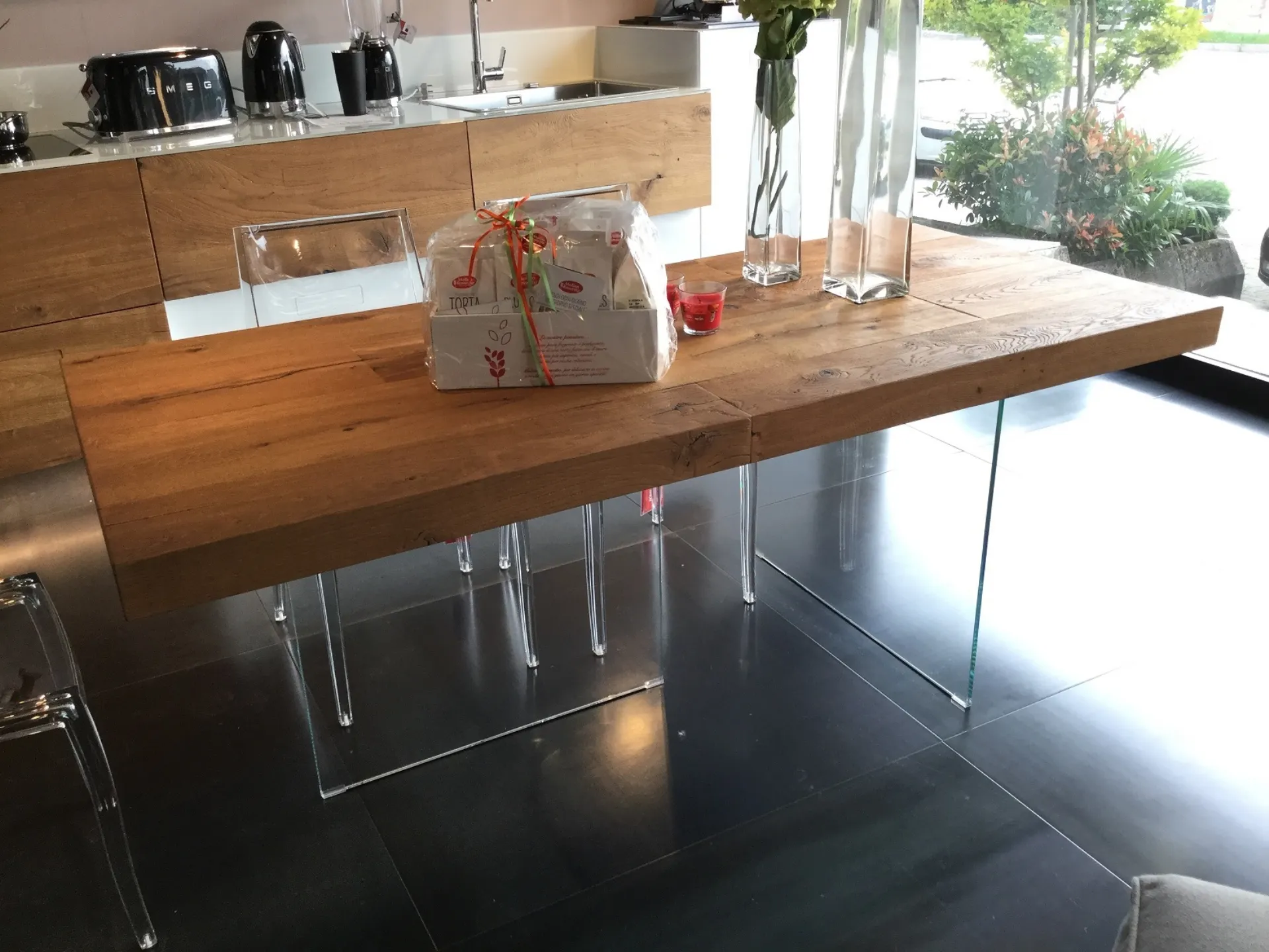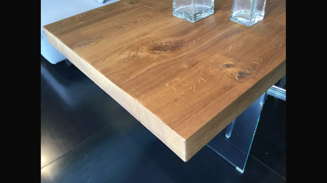FINITURA: Legno tamburato spess. 8cm in rovere termo trattato, Gambe in vetro trasparente temprato spess 1,2 cm, Wildwood Naturale / Teste Chiuse