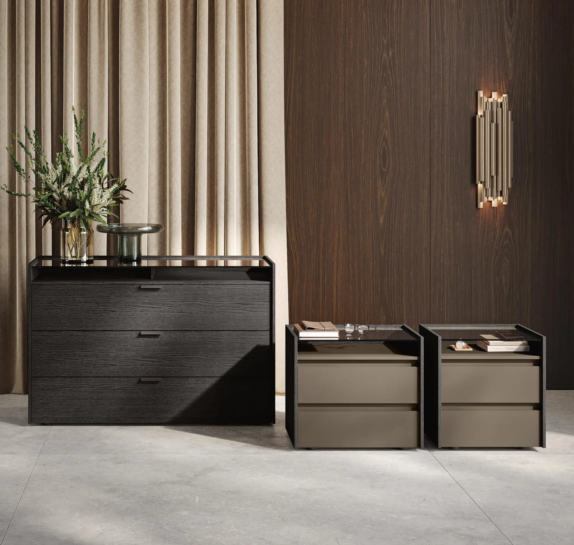 I Comodini, comò e gruppi notte possono essere abbinati al letto e all'armadio oppure possono essere in voluto contrasto con essi: la scelta si baserà sulle oggettive possibilità di spazio e sulla ricerca di un armonioso effeto finale. Valorizza i tuoi locali assicurandoti molta praticità, superficie per contenere e uno stile unico!. Il Gruppo Notte Kristal di Morassutti è una tra le più belle soluzioni capaci di regalare un accento di stile in più alla zona notte, con l'utilizzo di materie di pregio.