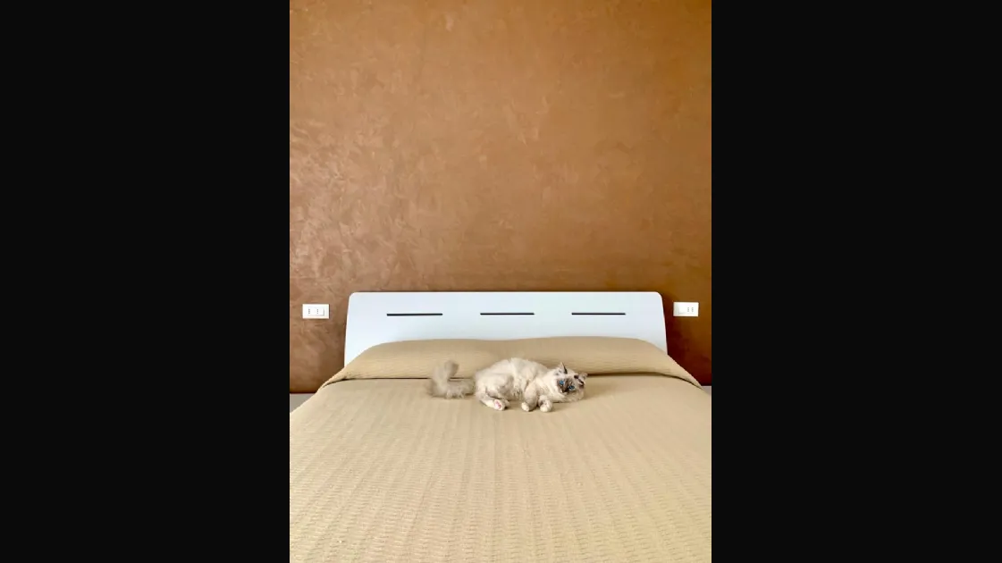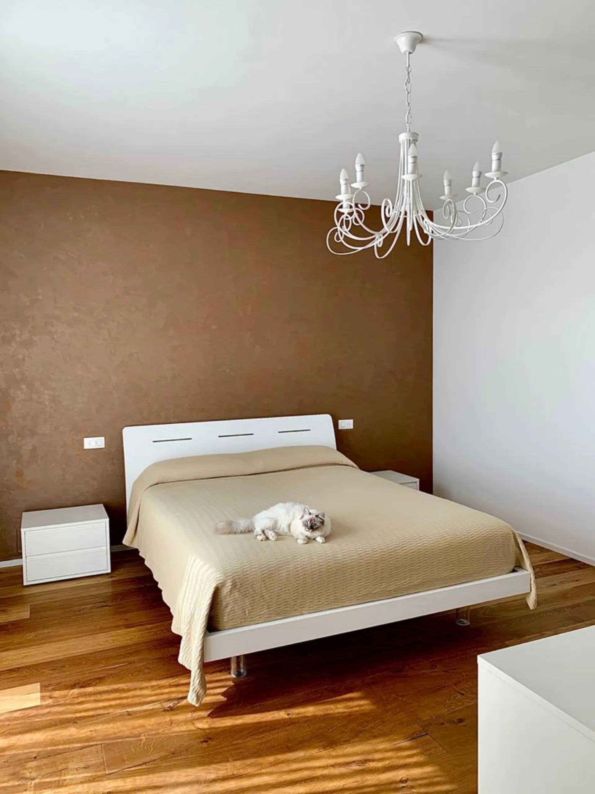 Camera completa arredata con letto e gruppo in materico bianco, con design essenziale