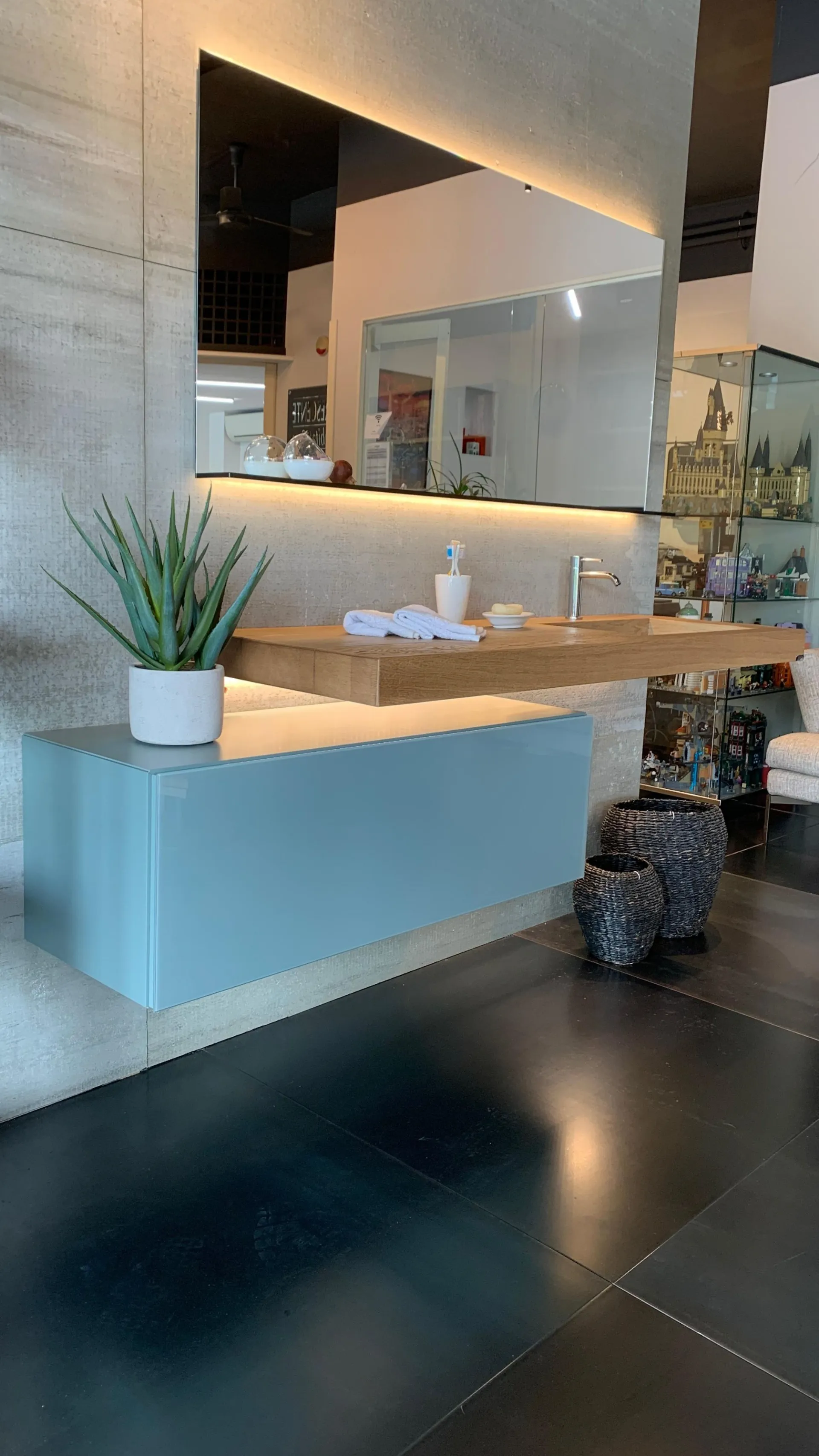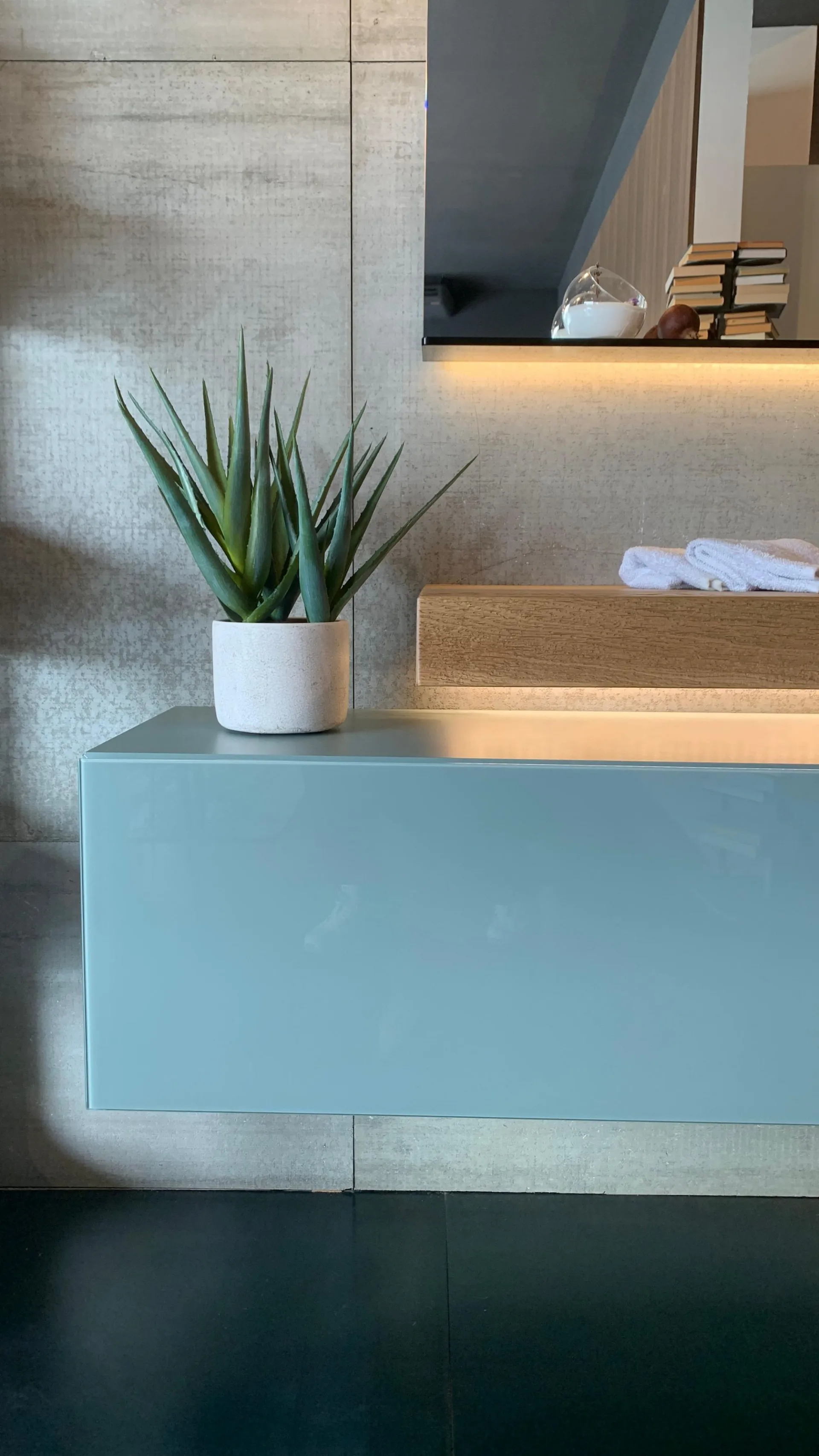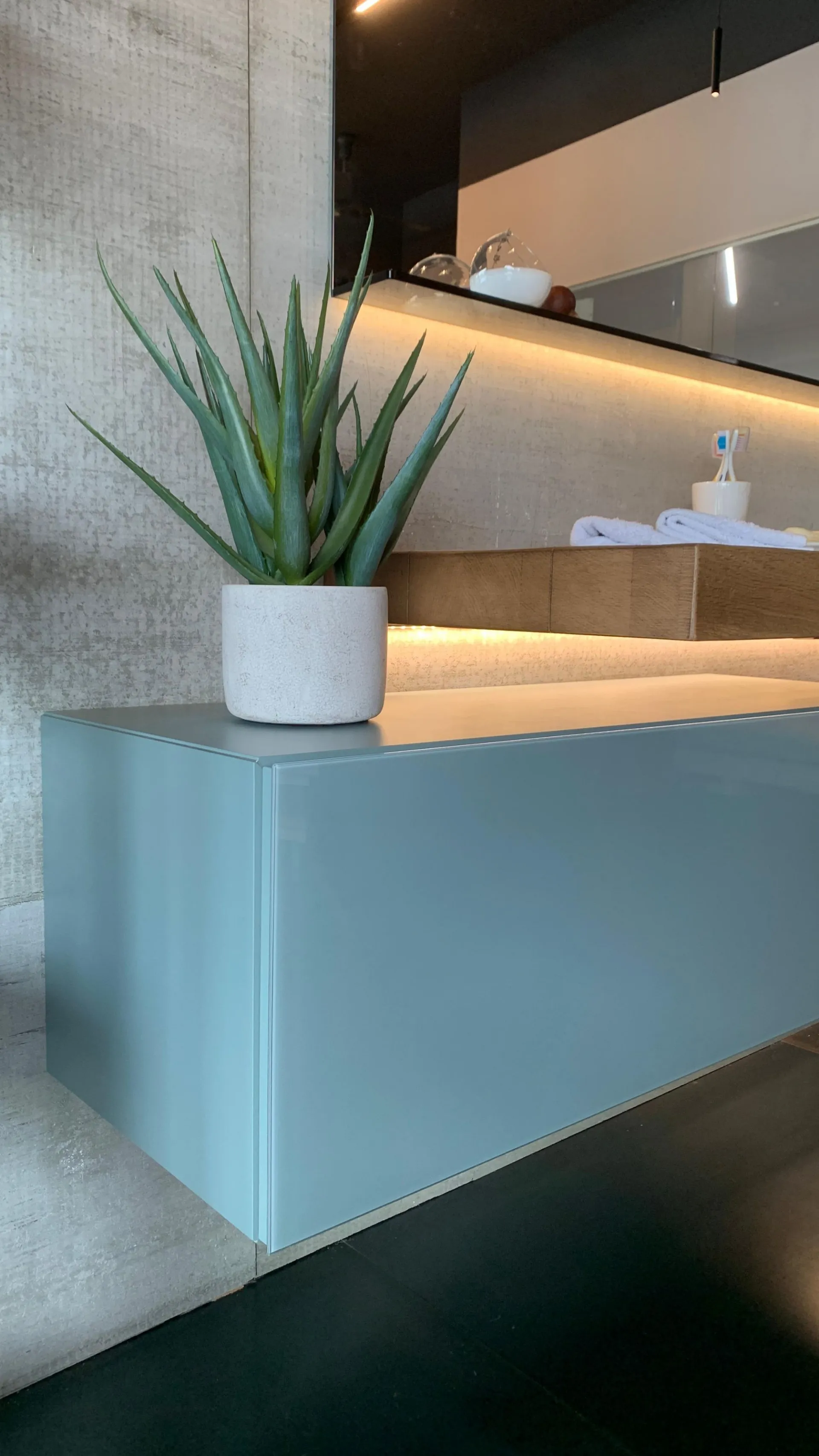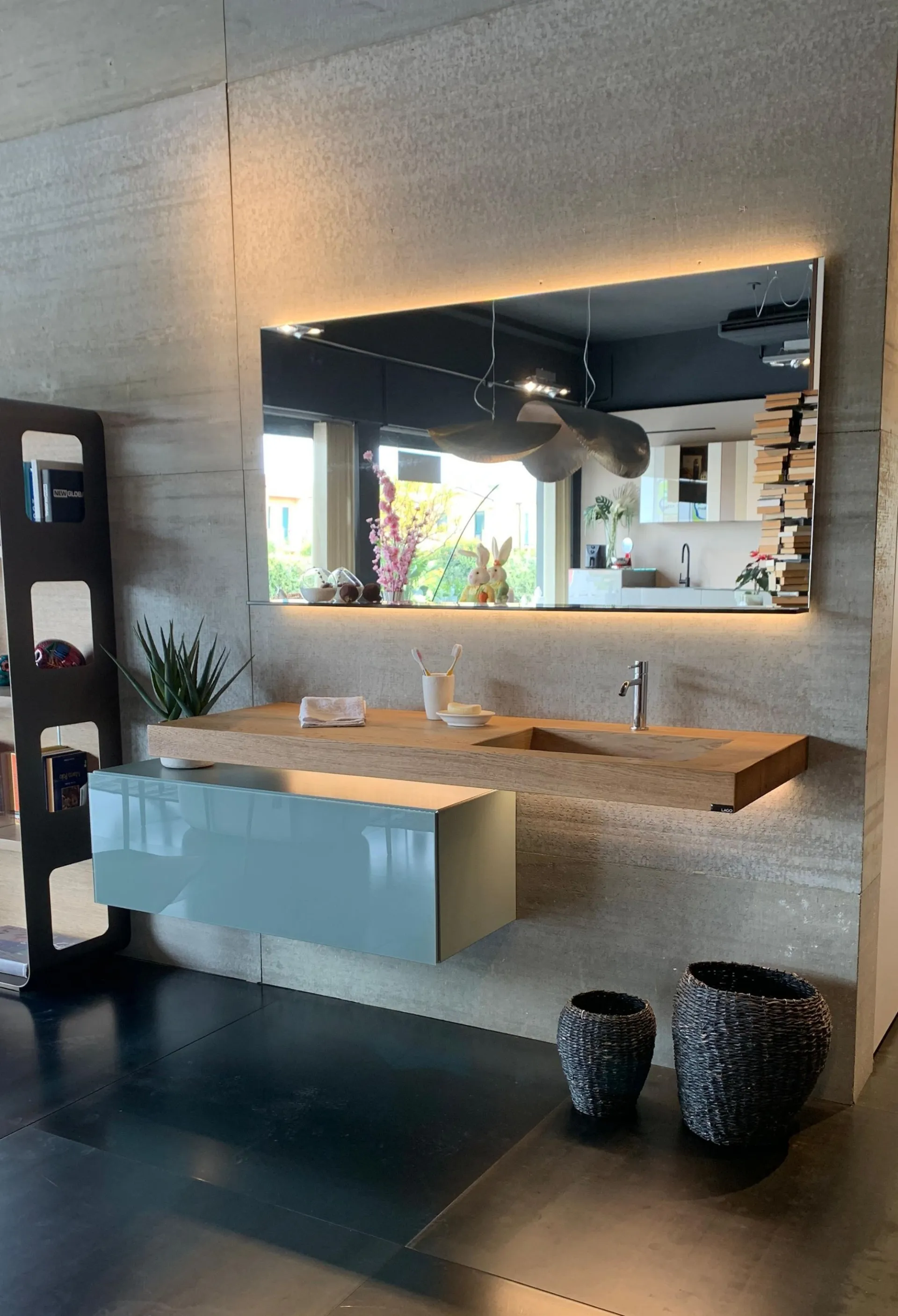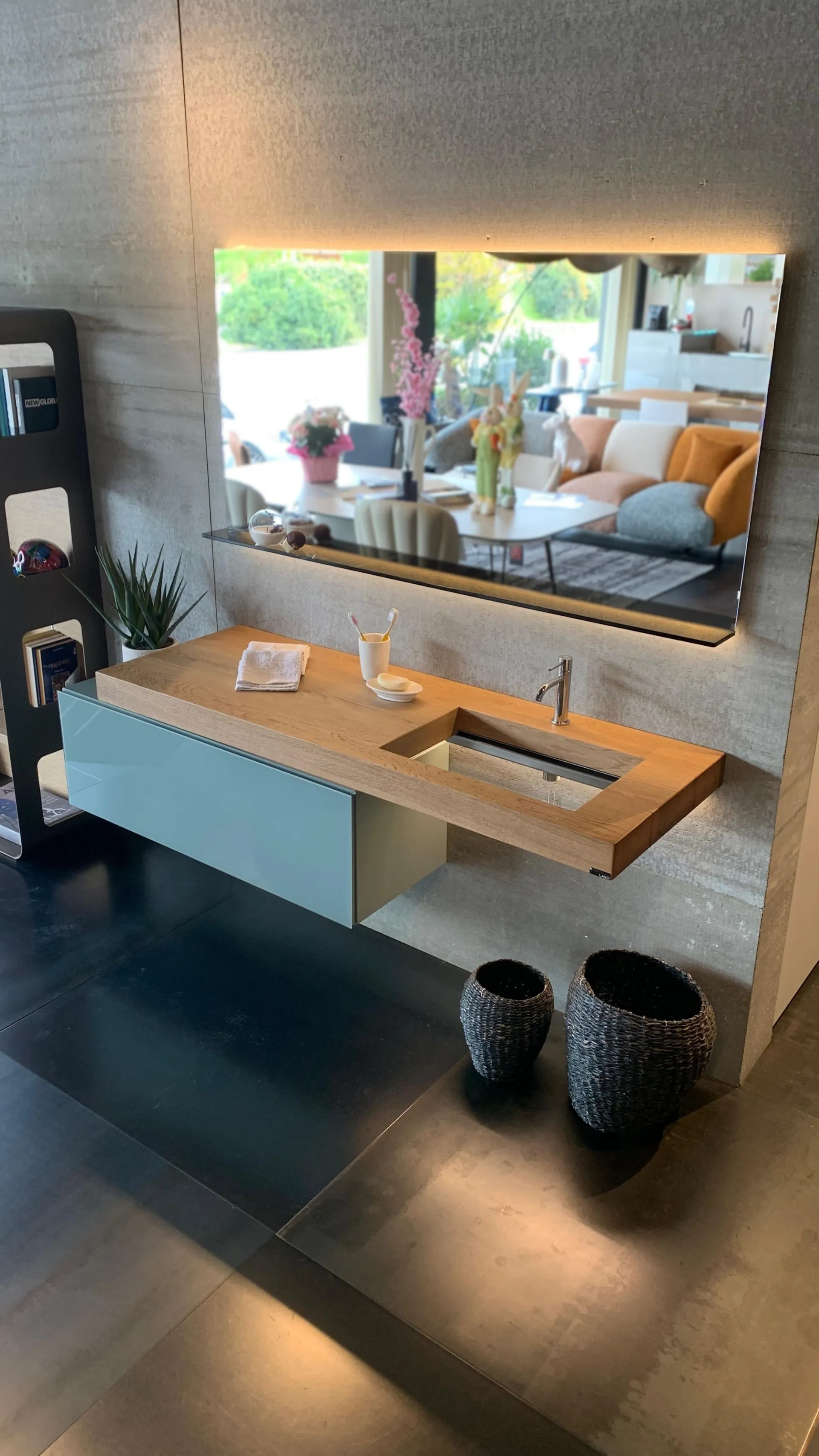 FINITURA: Cestone 36e8 in legno laccato con frontale vetro lucido colore ARGILLA + Lavabo Depth in rovere finitura Wildwood naturale con vasca in vetro trasparente temperato + Specchiera Glasserie con mensola vetro temperato fumè bronzo, 2 led sui lati lunghi compresi con alimentatore
