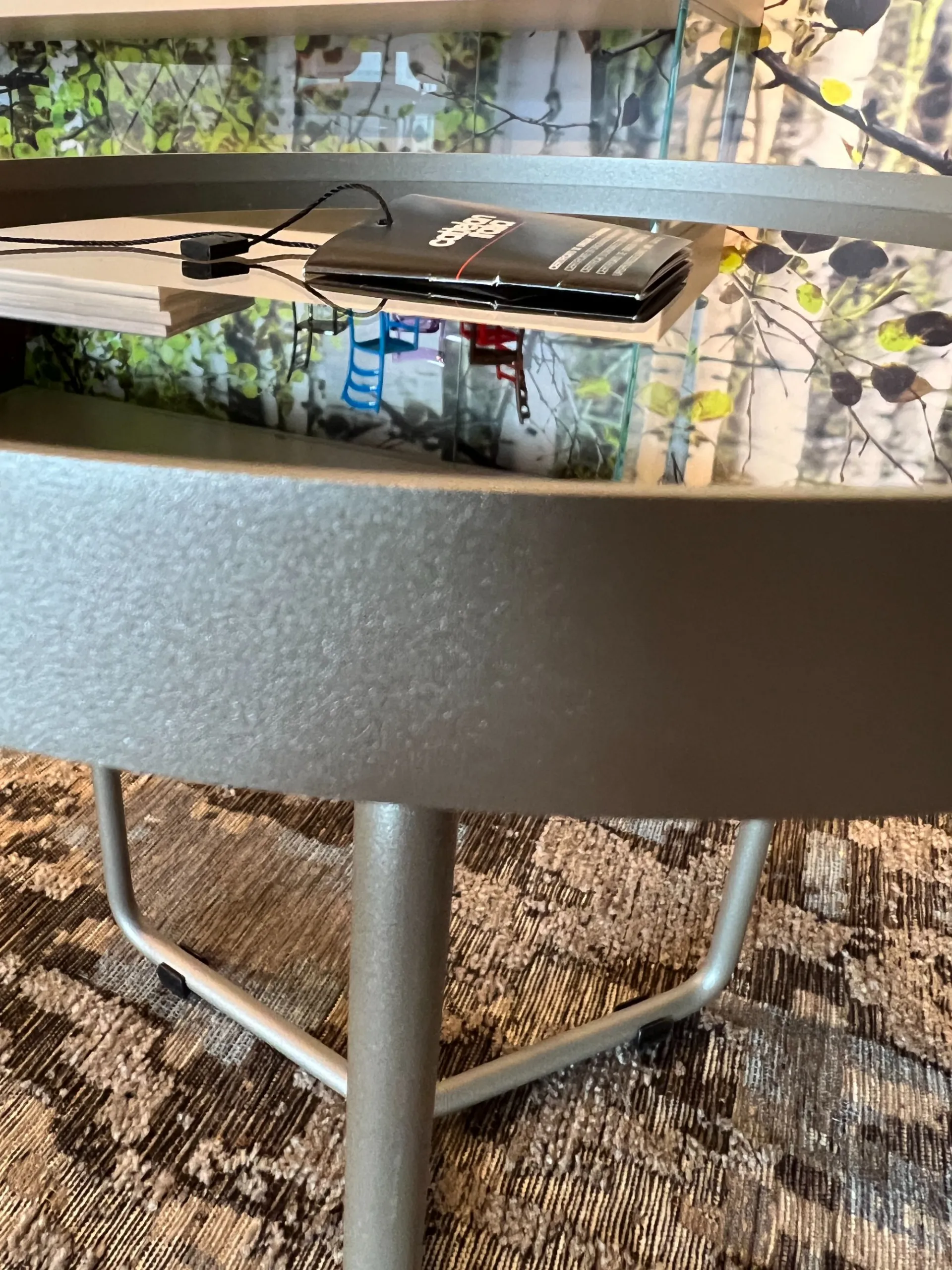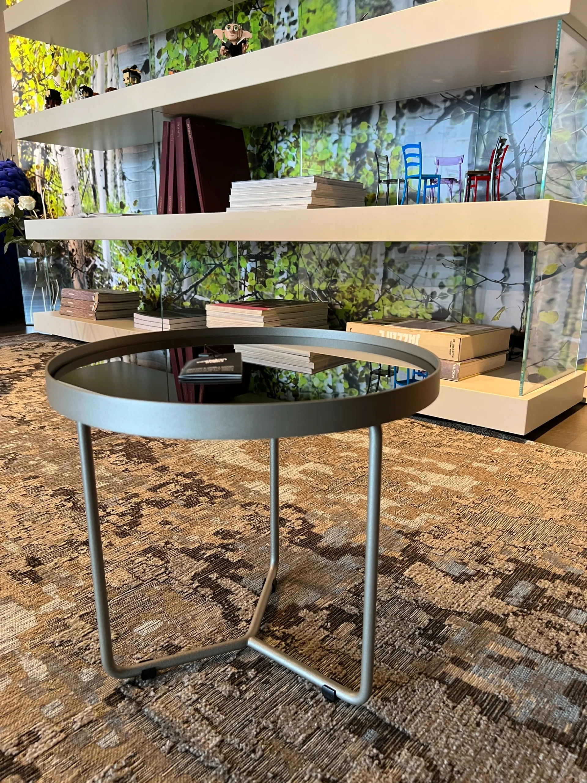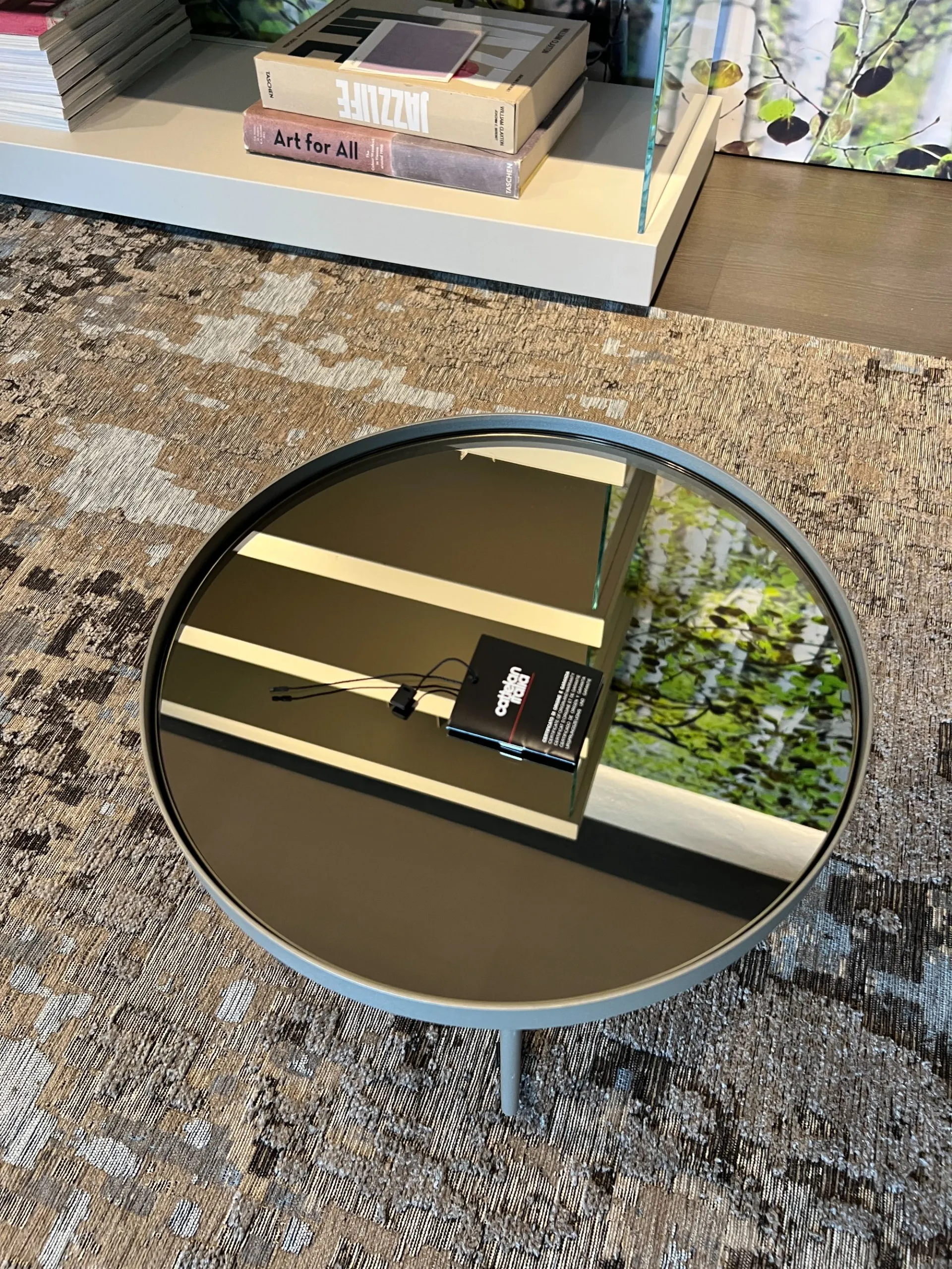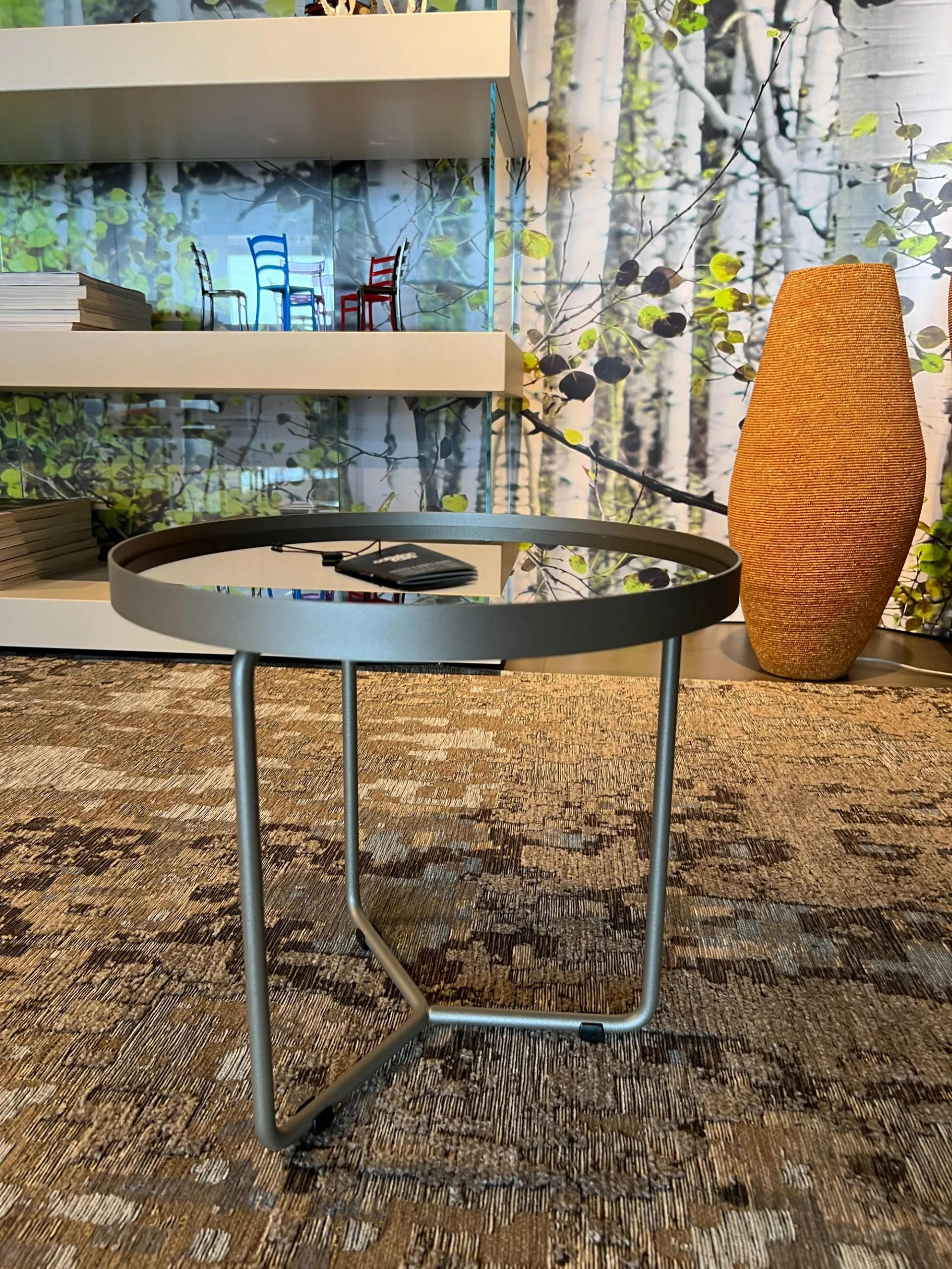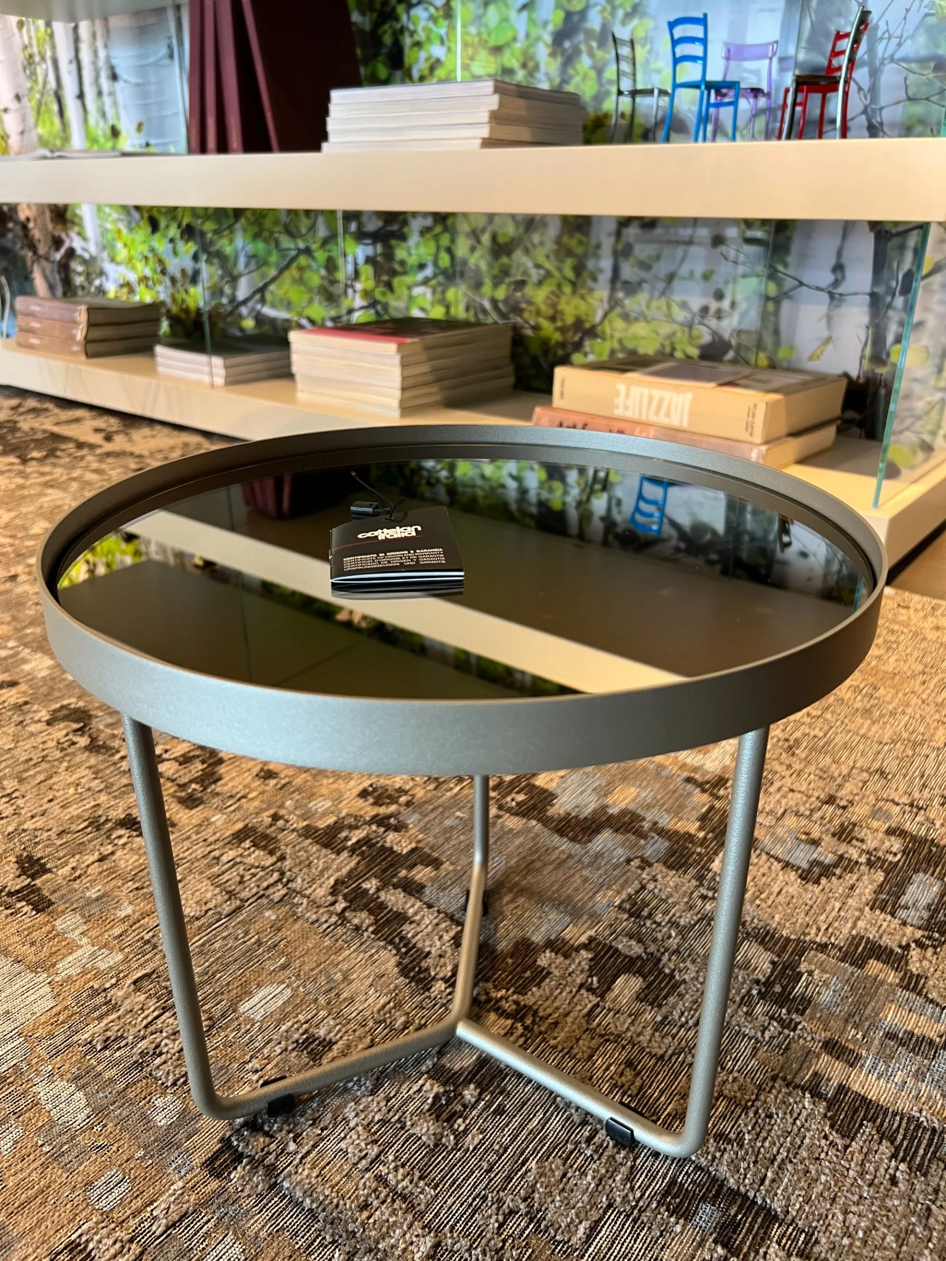 FINITURA: Struttura in acciaio verniciato goffrato titanio (GFM11). Piano in cristallo specchiato bronzo.