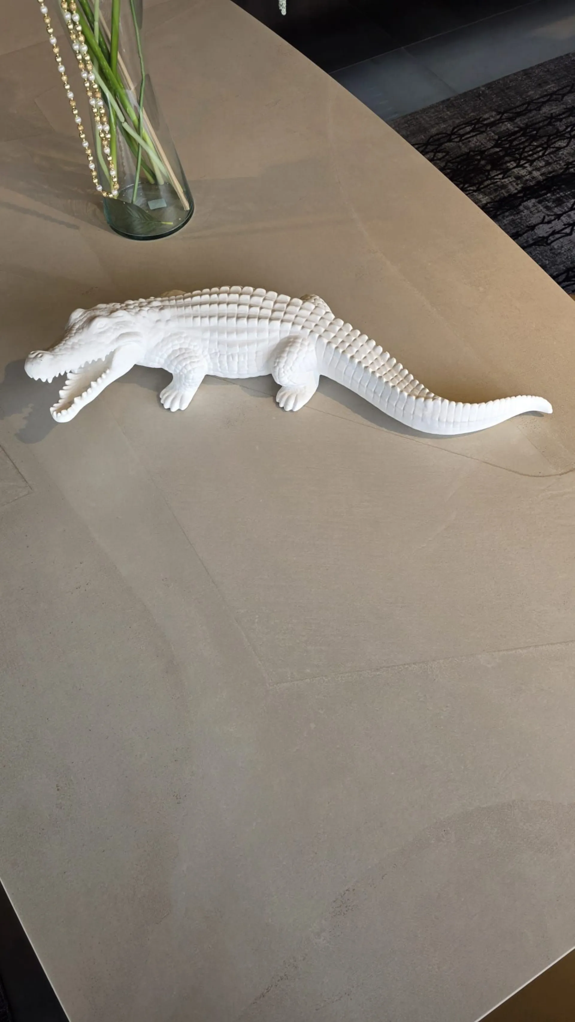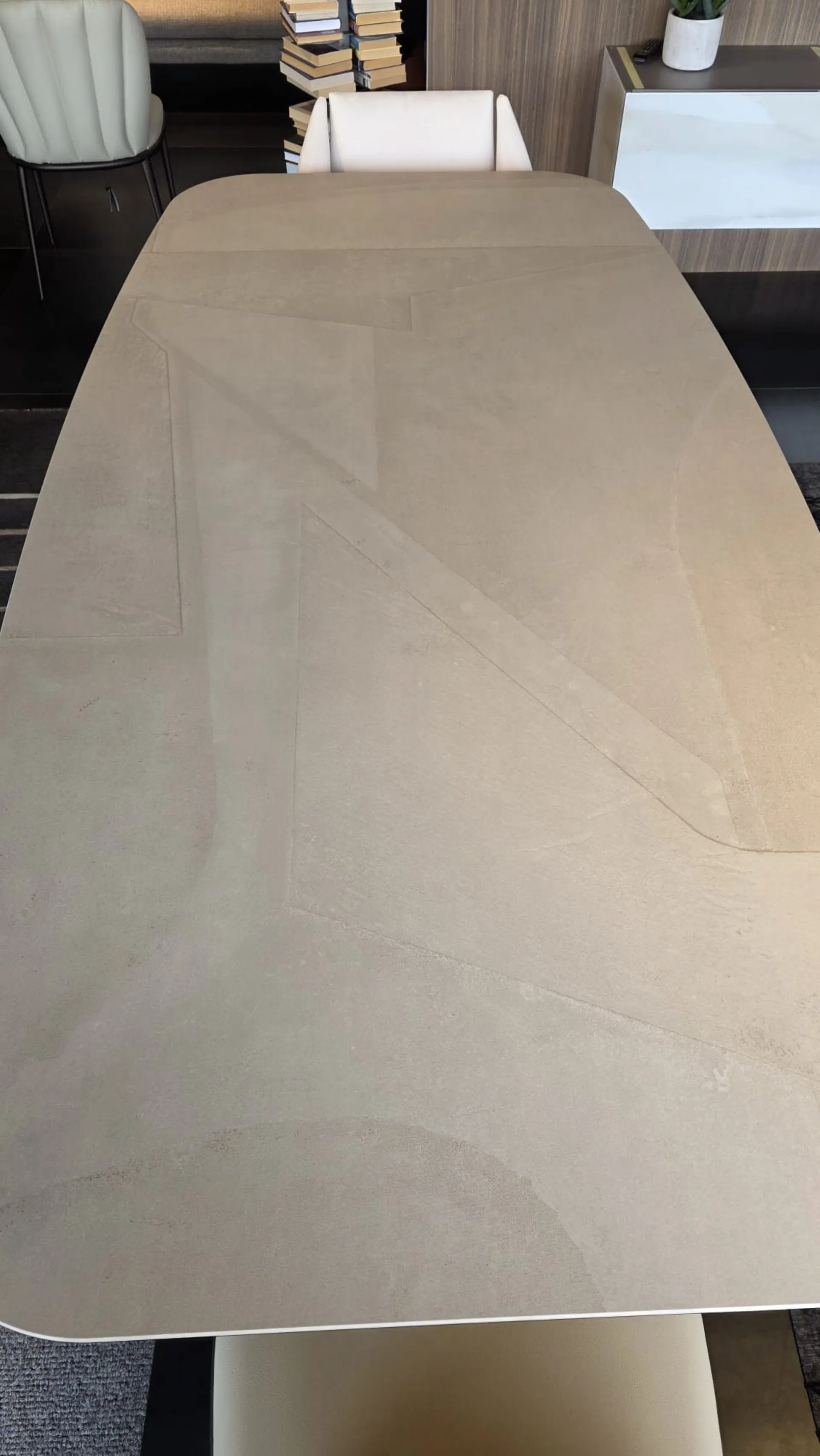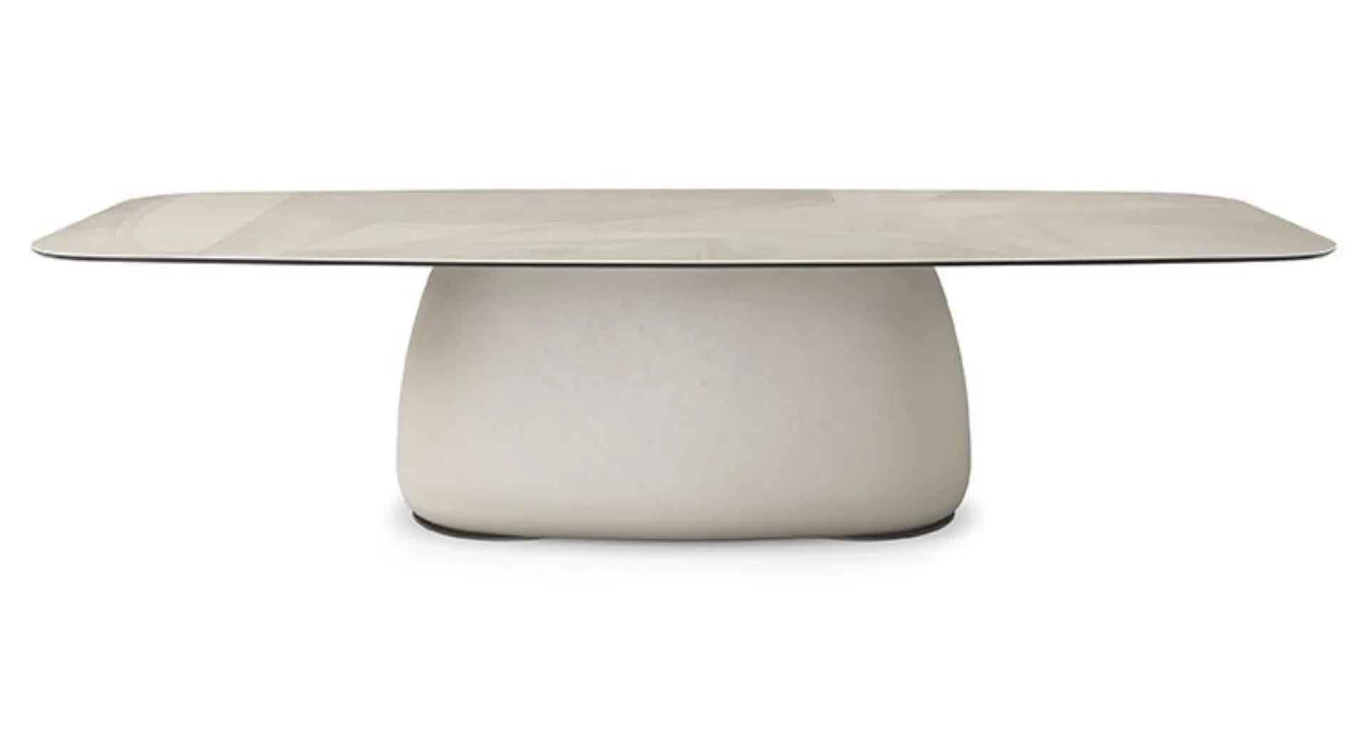 FINITURA: Tavolo con base in polimero spatolato in argilla colore Oslo (AR09). Piastra di base in metallo verniciato nero (GFM73). Piano in ceramica marmi Luxor (KS23).