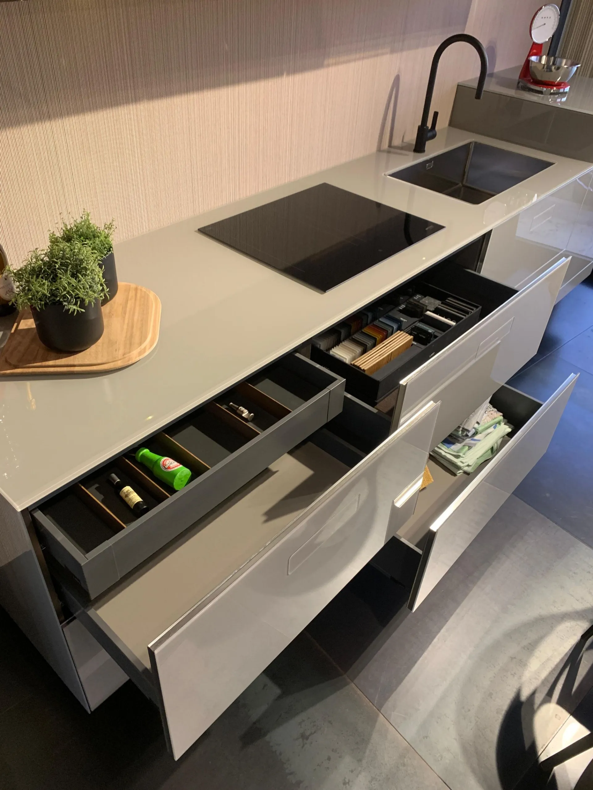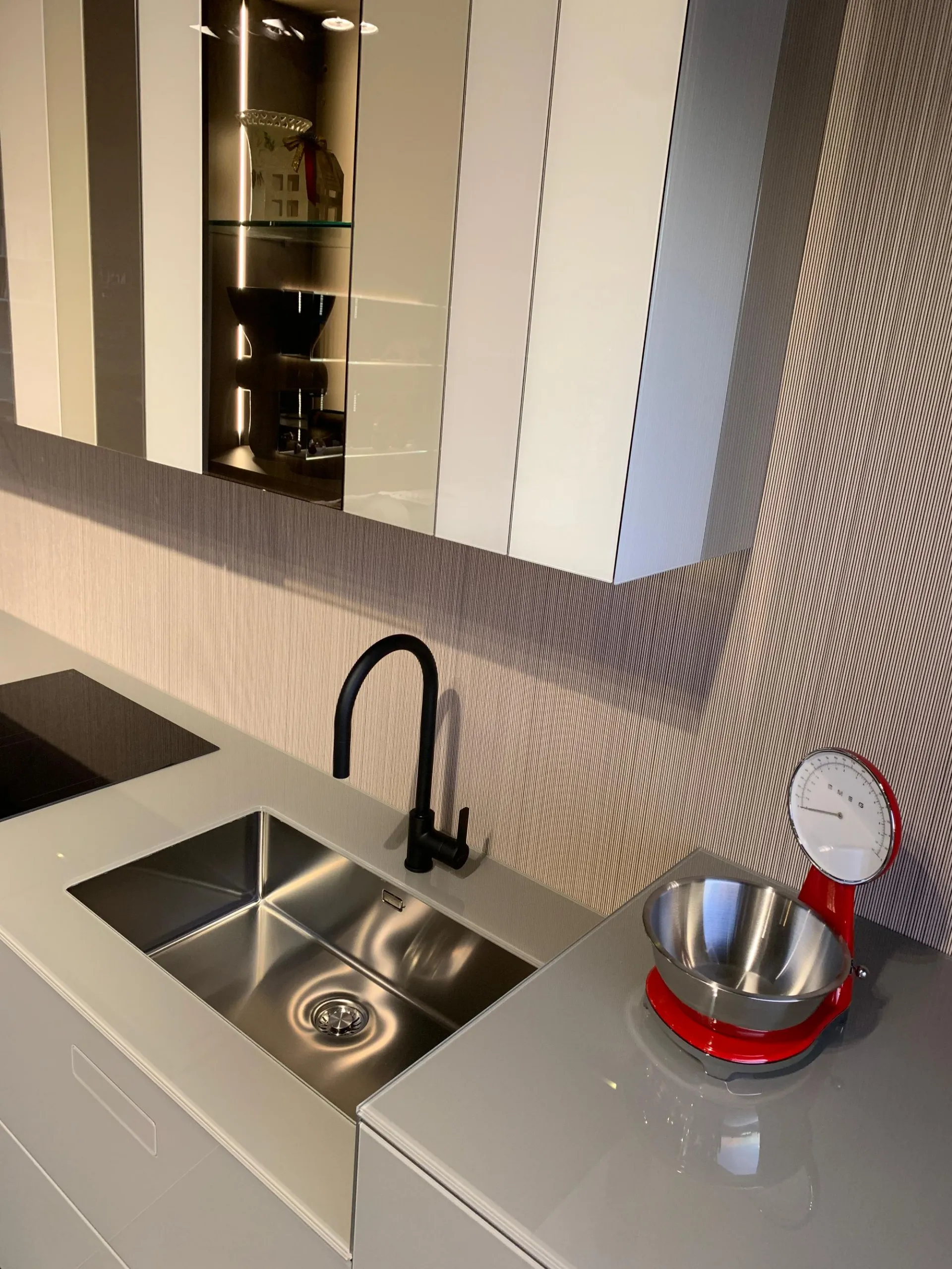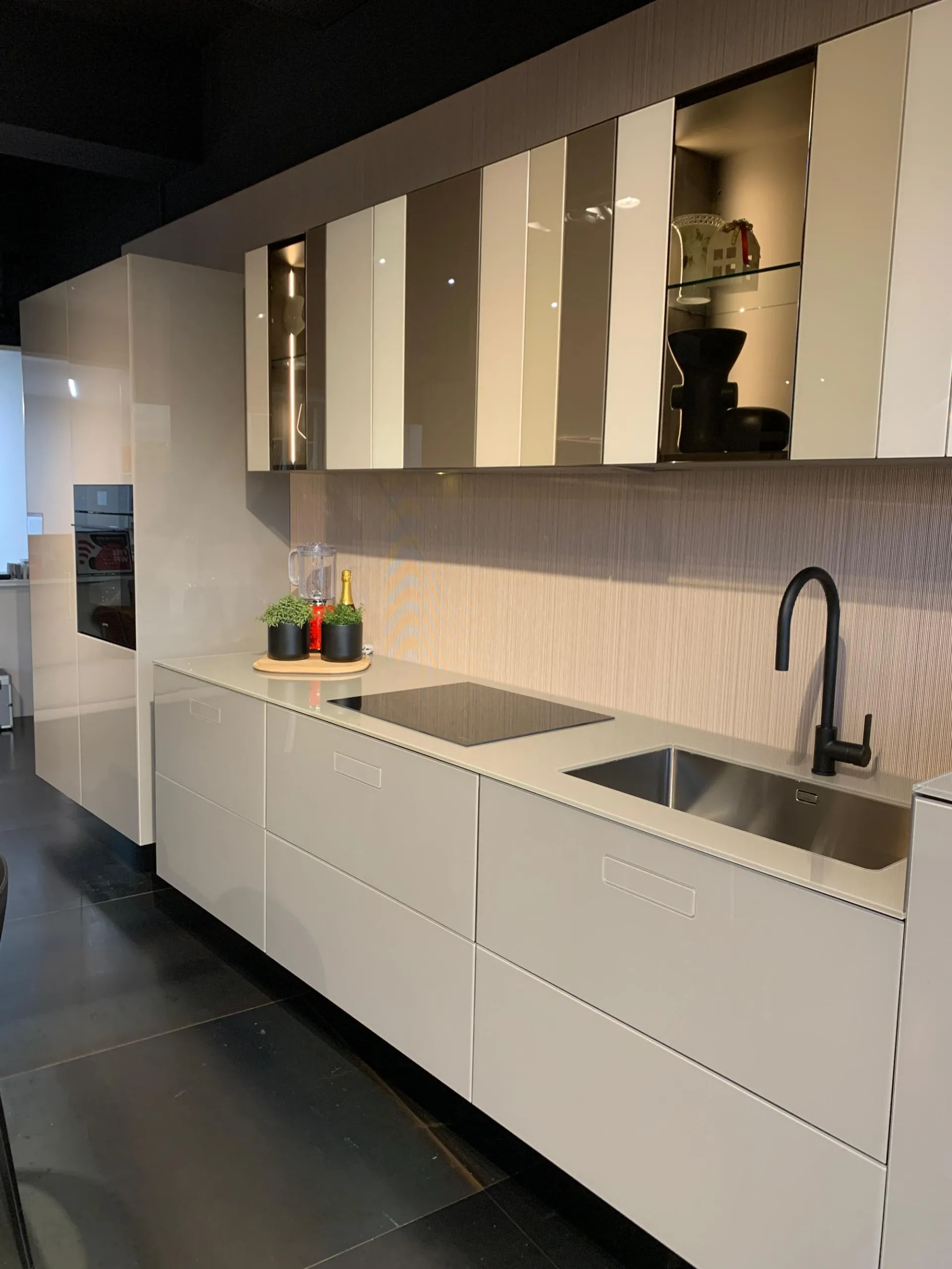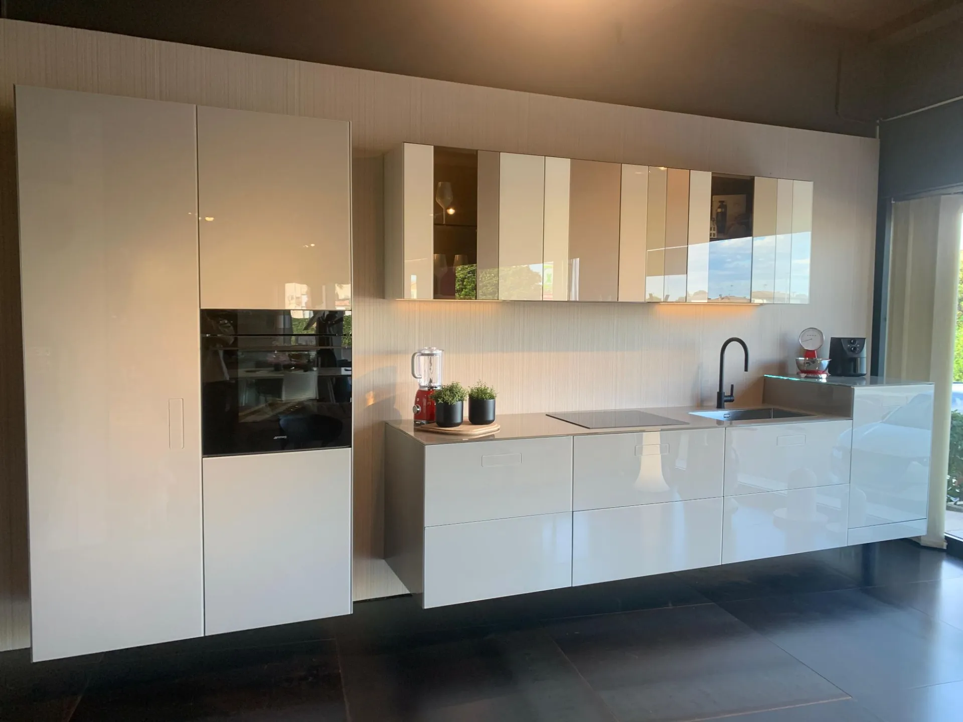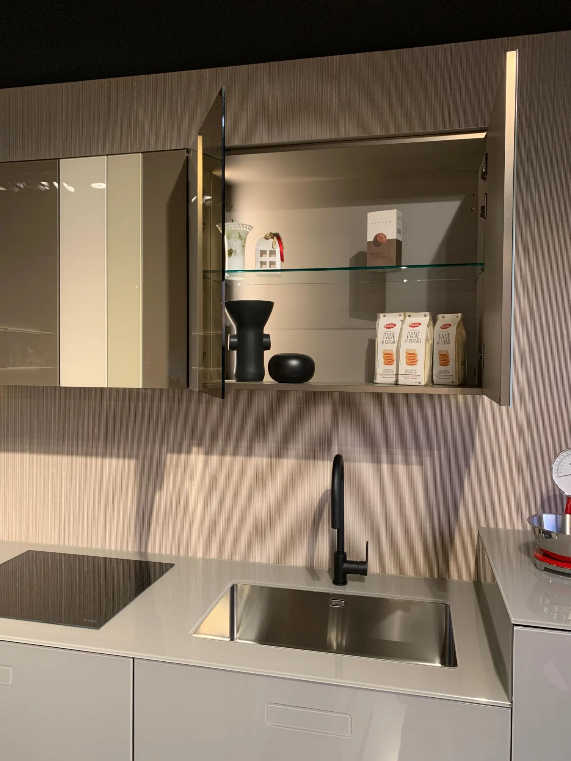 FINITURA: Basi, Colonne e Top in Vetro lucido colore Tortora, pensili in Vetro lucido colori Iuta, Champagne Metal, Cocco, Bianco, Spago