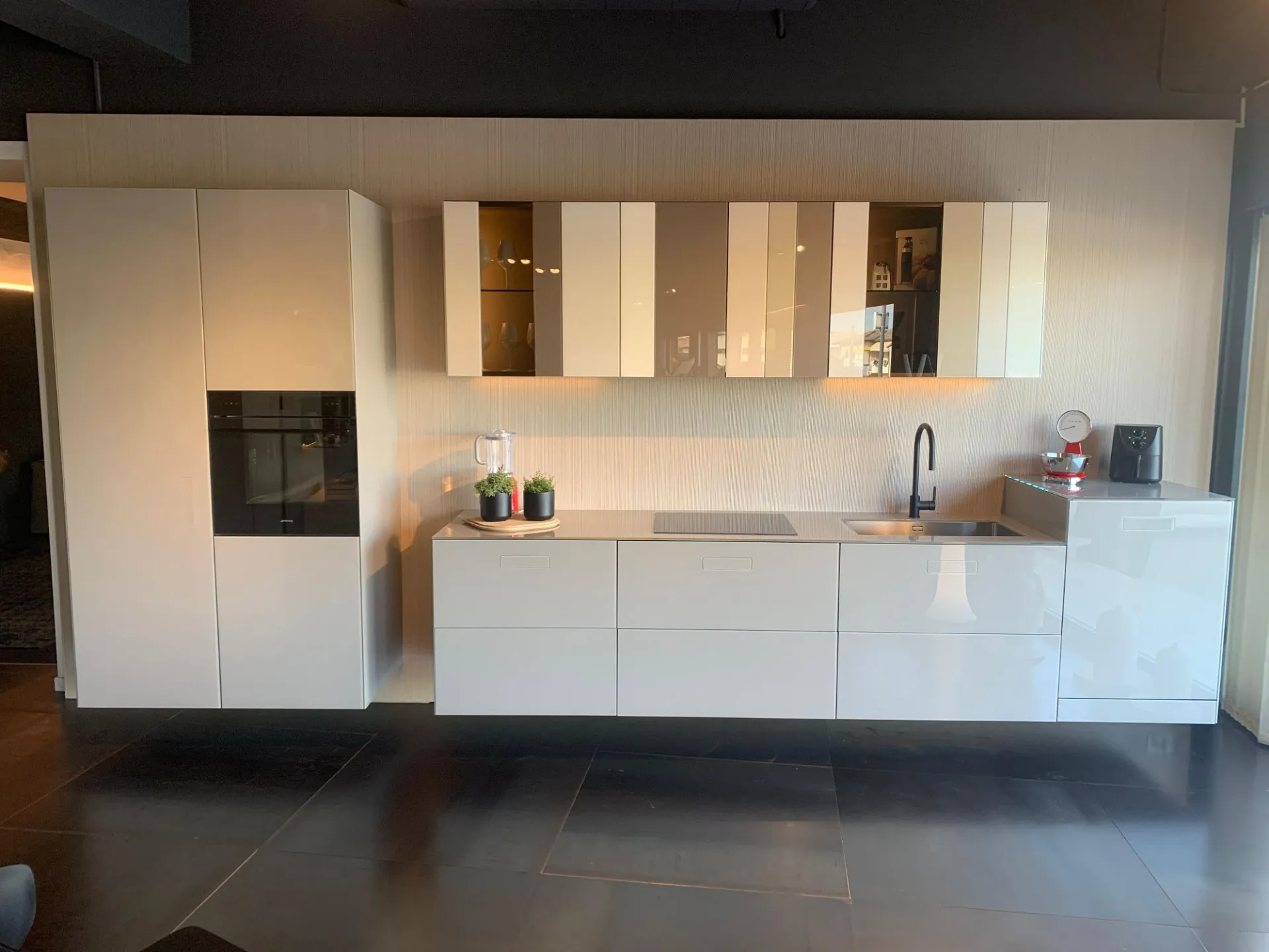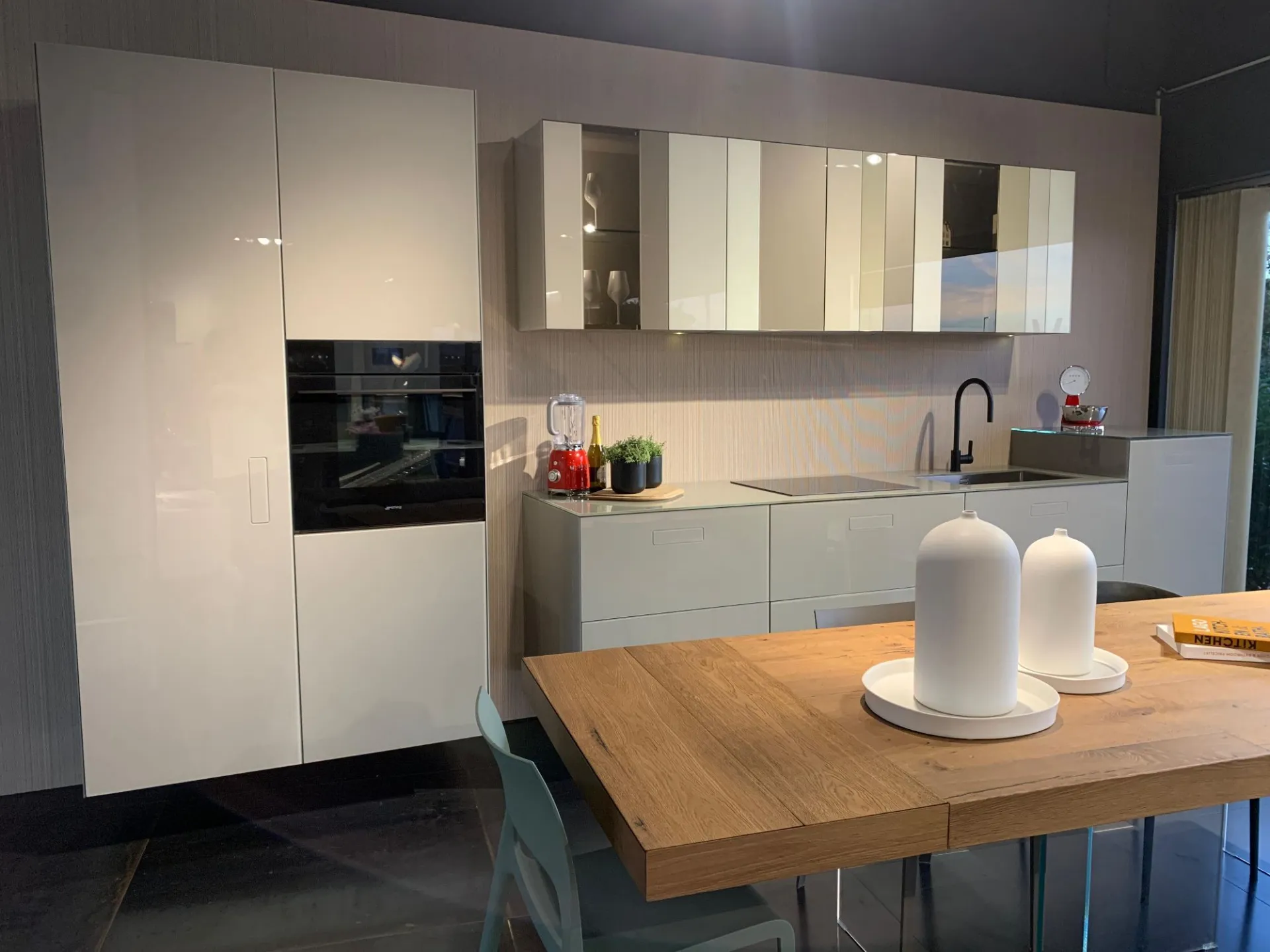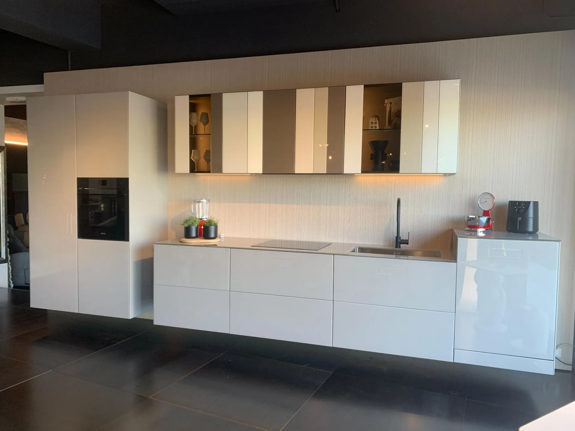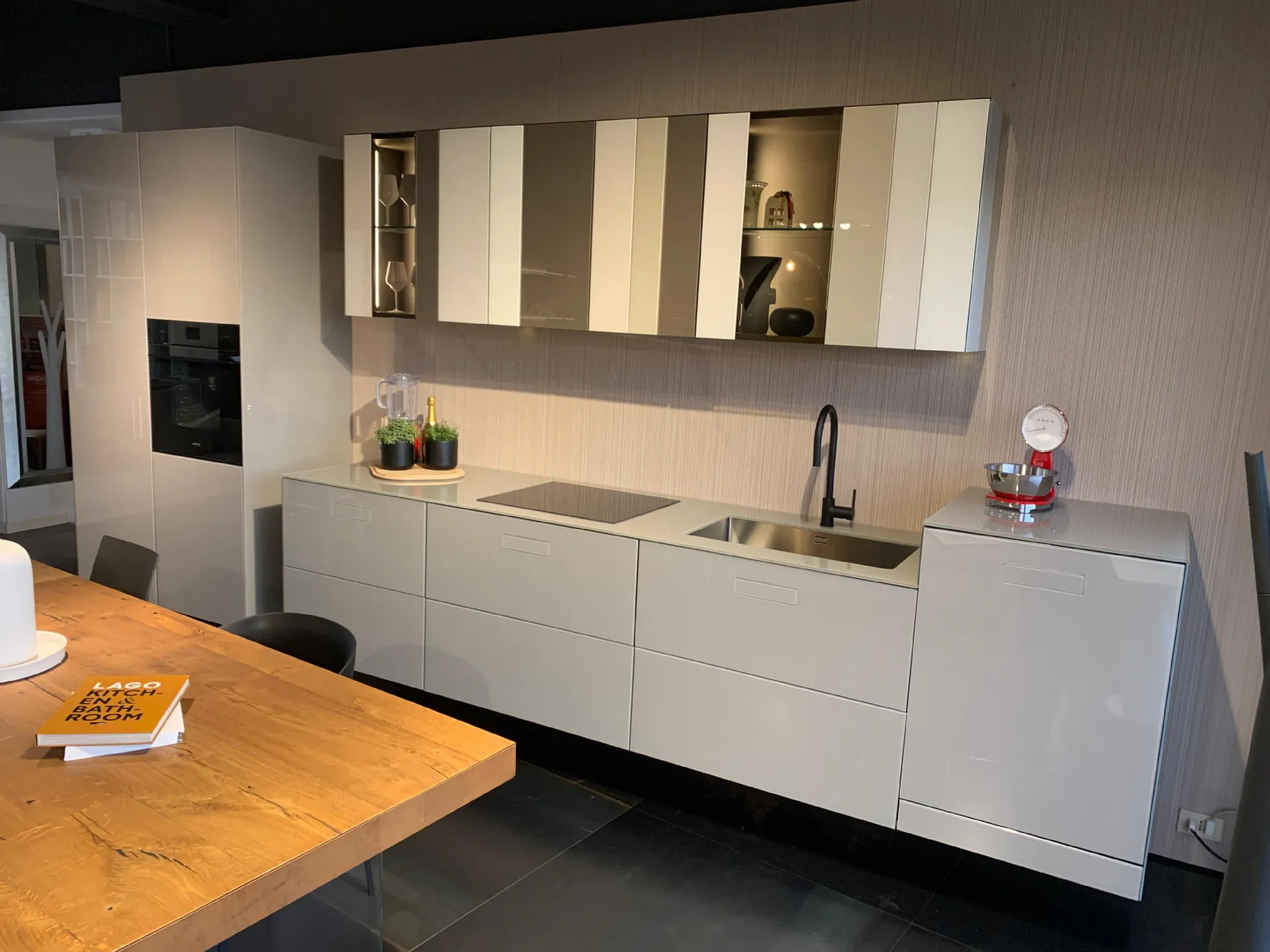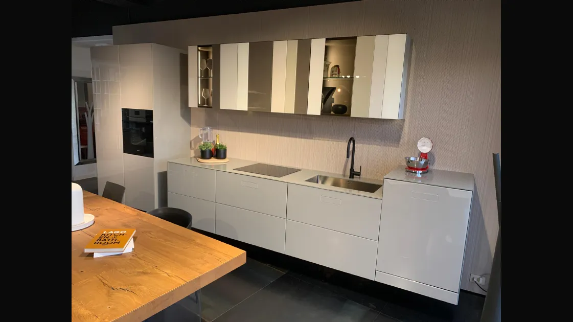 FINITURA: Basi, Colonne e Top in Vetro lucido colore Tortora, pensili in Vetro lucido colori Iuta, Champagne Metal, Cocco, Bianco, Spago