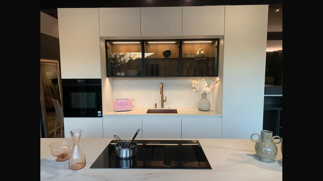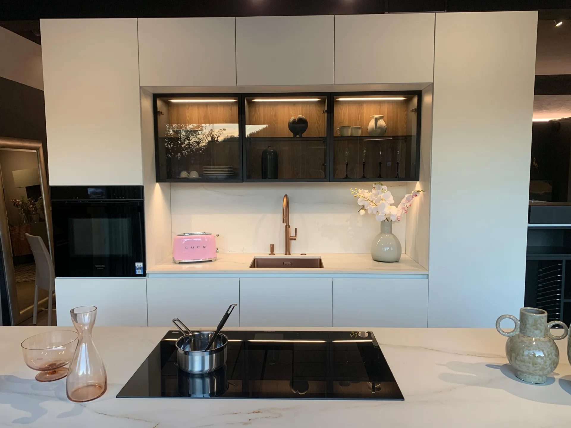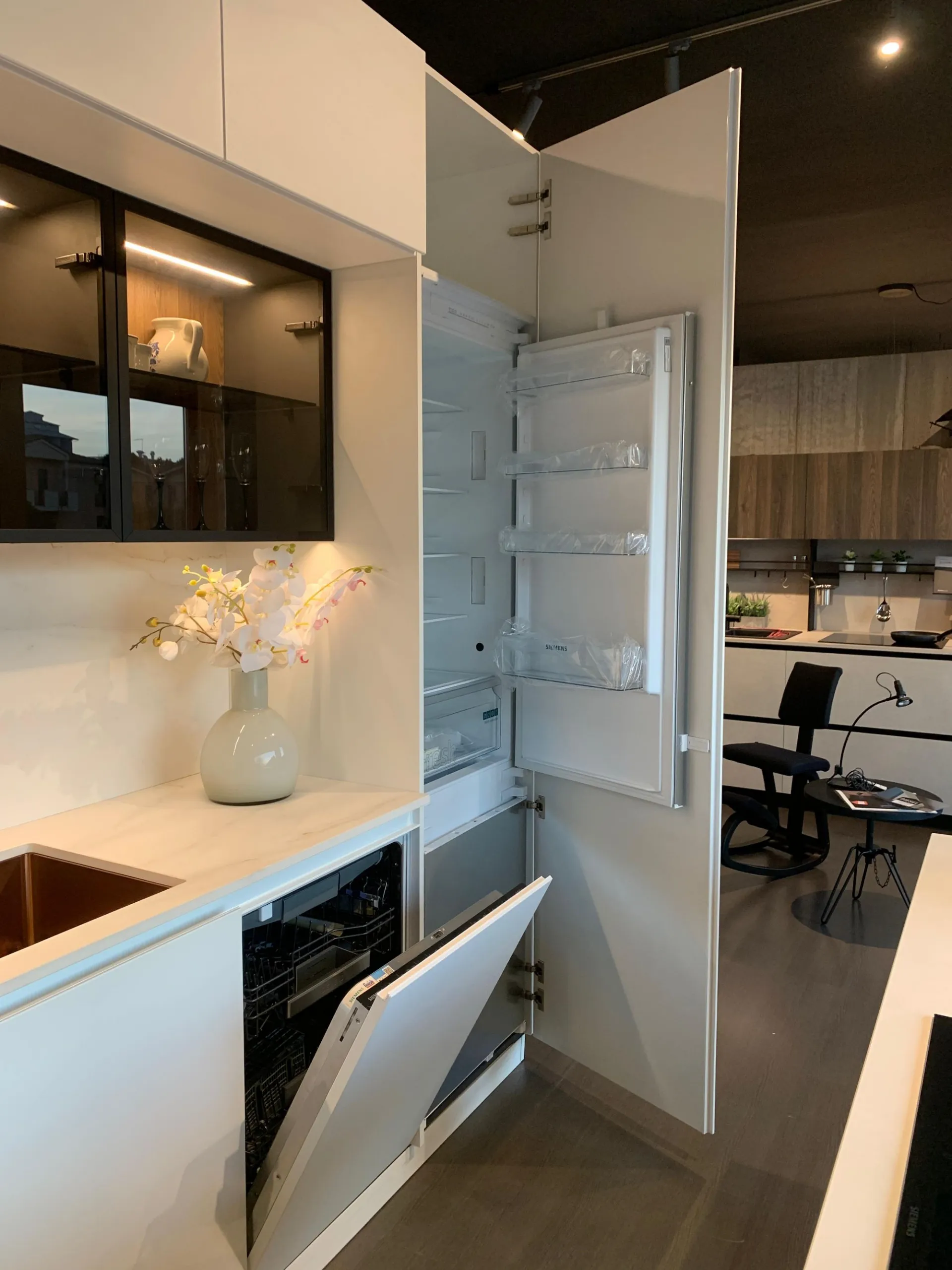 FINITURA: Colonne, Basi e Sovrapensili LACCATO OPACO BIANCO, Zoccoli H 10, Profili maniglia e Gole Colonne in ALLUMINIO BIANCO, Top e fianchi isola ABITUM LINCOLN ORO, Scocca BIANCA, Pensili con frontale VETRO BRONZATO e schiene CUMINO, Eldom SIEMENS STUDIOLINE Home Connected