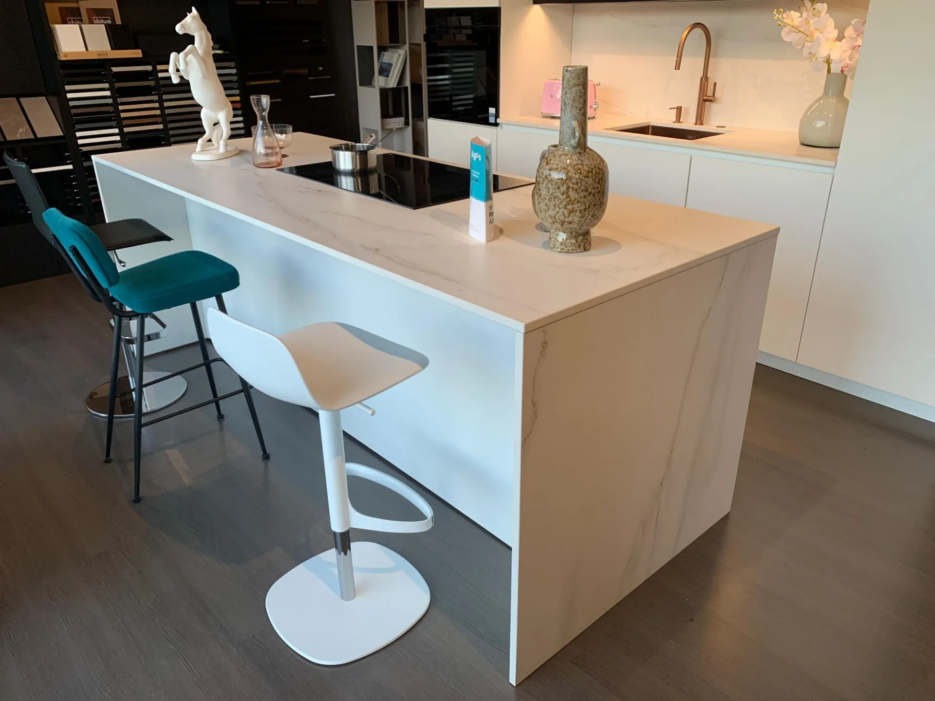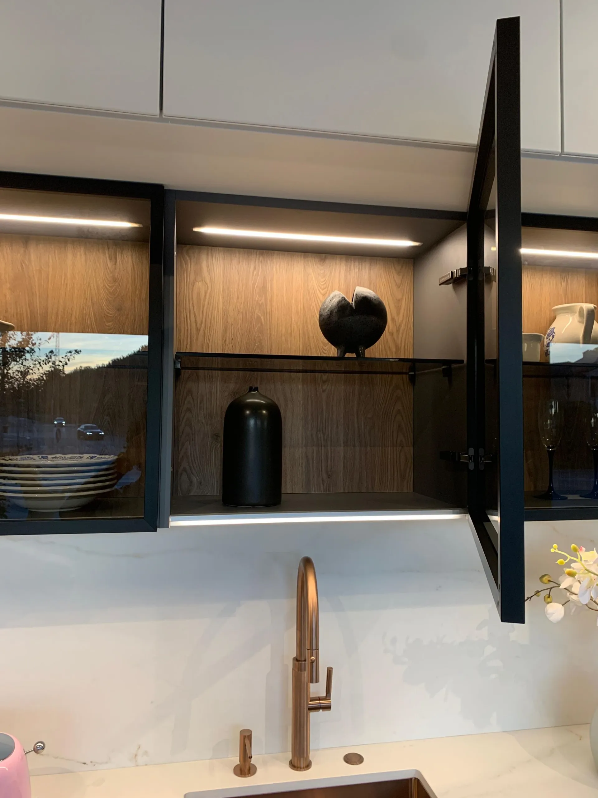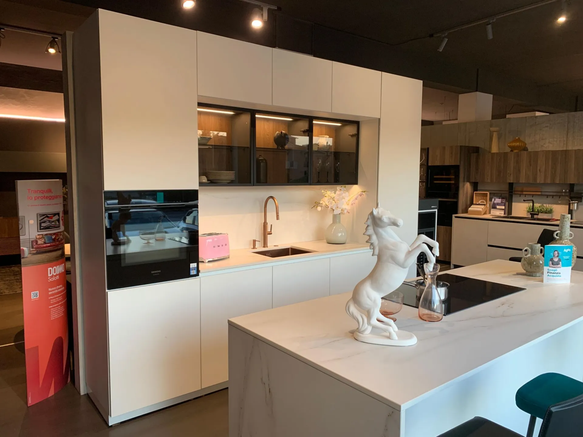 FINITURA: Colonne, Basi e Sovrapensili LACCATO OPACO BIANCO, Zoccoli H 10, Profili maniglia e Gole Colonne in ALLUMINIO BIANCO, Top e fianchi isola ABITUM LINCOLN ORO, Scocca BIANCA, Pensili con frontale VETRO BRONZATO e schiene CUMINO, Eldom SIEMENS STUDIOLINE Home Connected