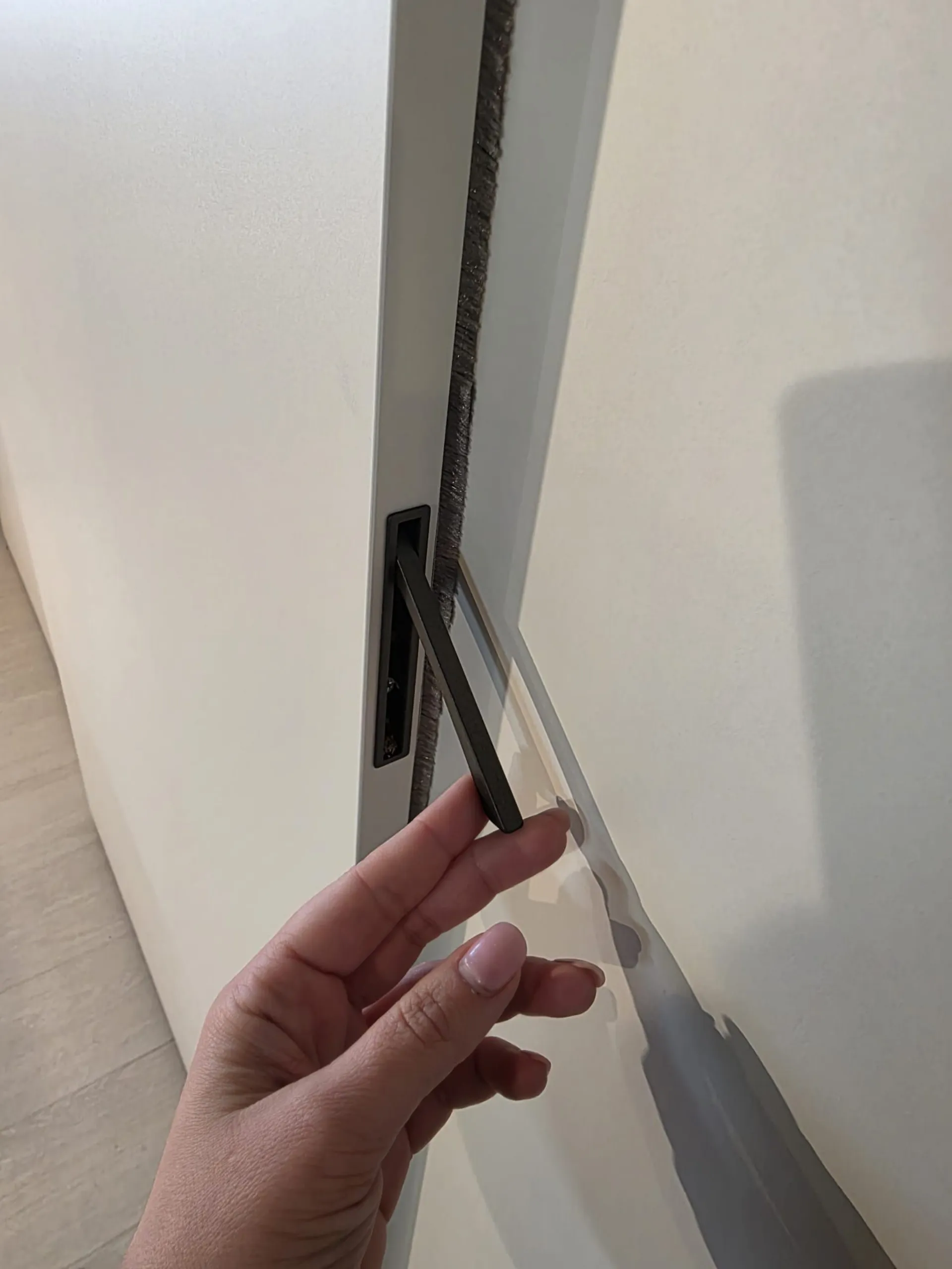 FINITURA: Ante Melaminico Tortora, maniglia in alluminio brunito modello Flip, Interni melaminico Rovere.