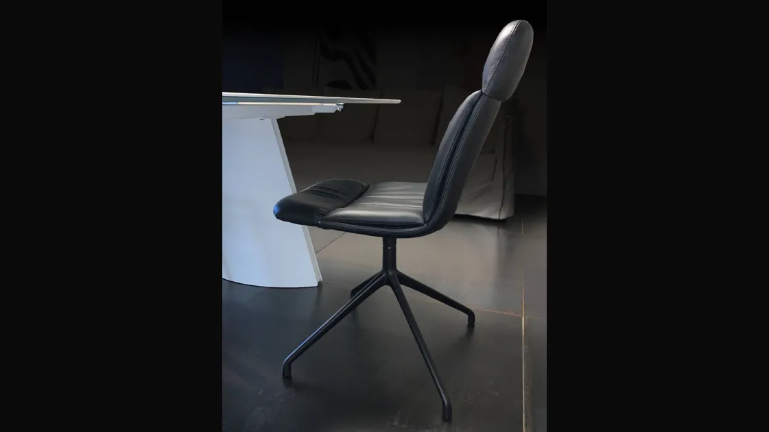 FINITURA: Sedia girevole con base a 4 razze in alluminio verniciato goffrato nero (GFM73) a polveri epossidiche. Seduta e schienale rivestiti in pelle nera, non sfoderabile. Scocca in legno multistrato di faggio e pioppo. Imbottitura in poliuretano espanso con densità variabile. Adatta solo per uso interno.