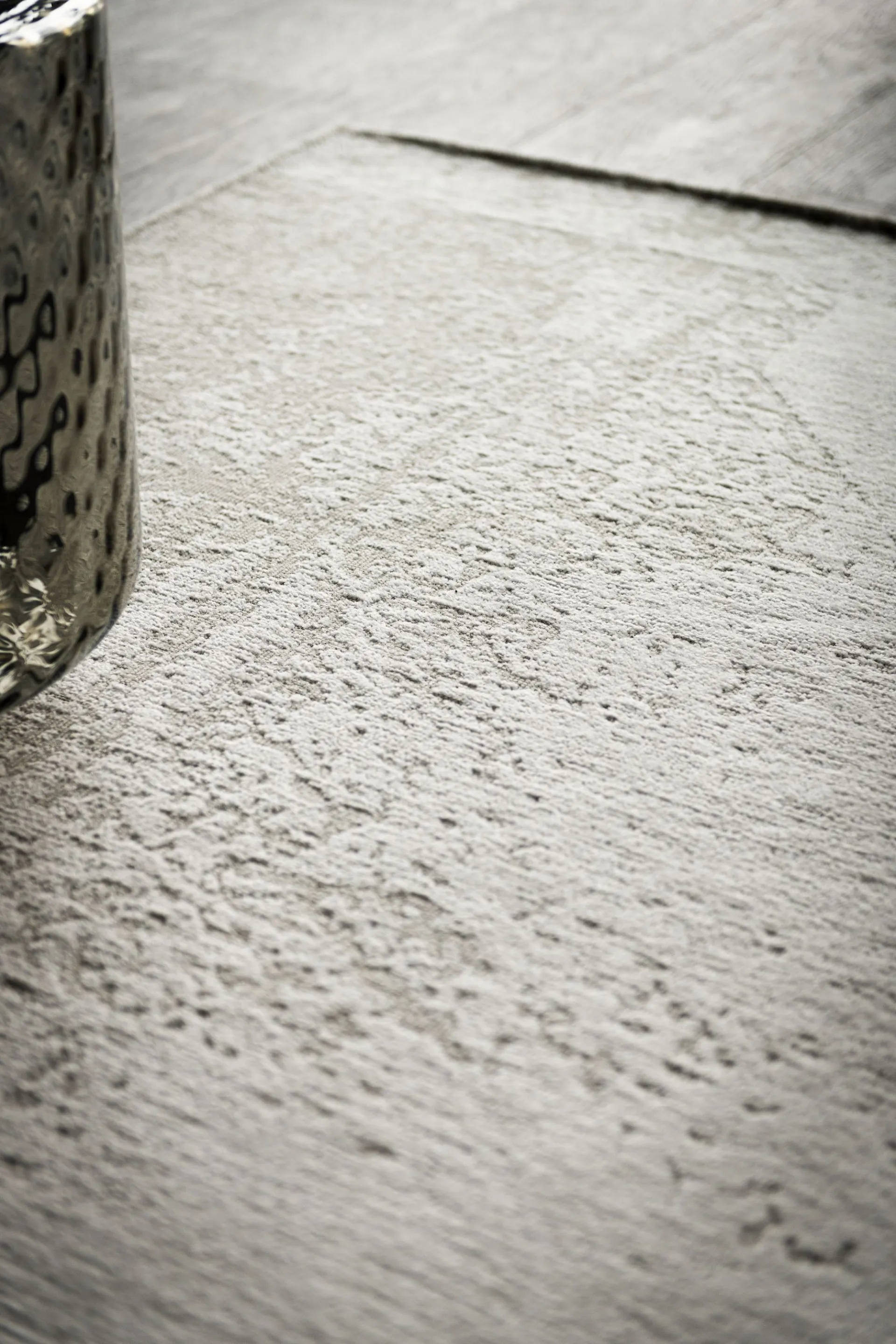 FINITURA: Tappeto tessuto in cotone, poliestere ed acrilico con disegno in rilievo in lana, colore Ivory (01)