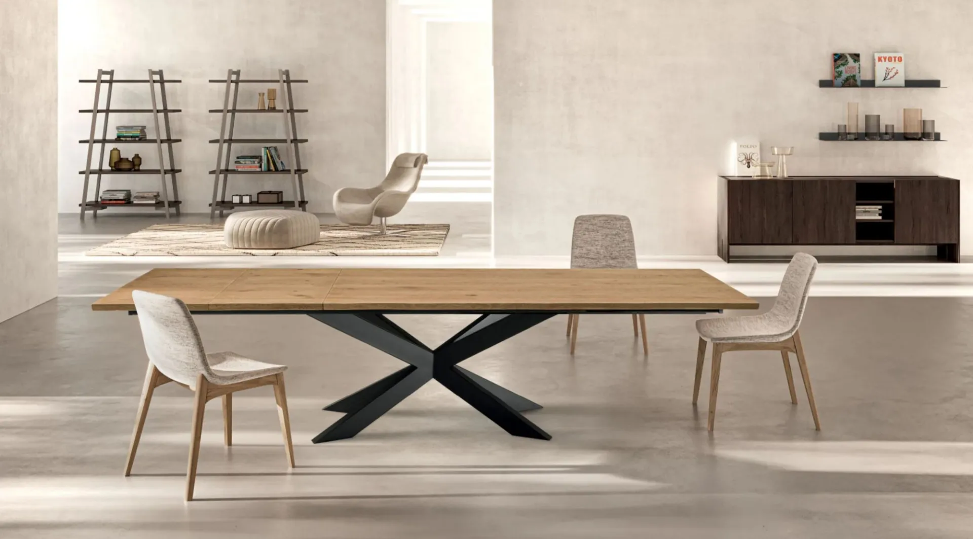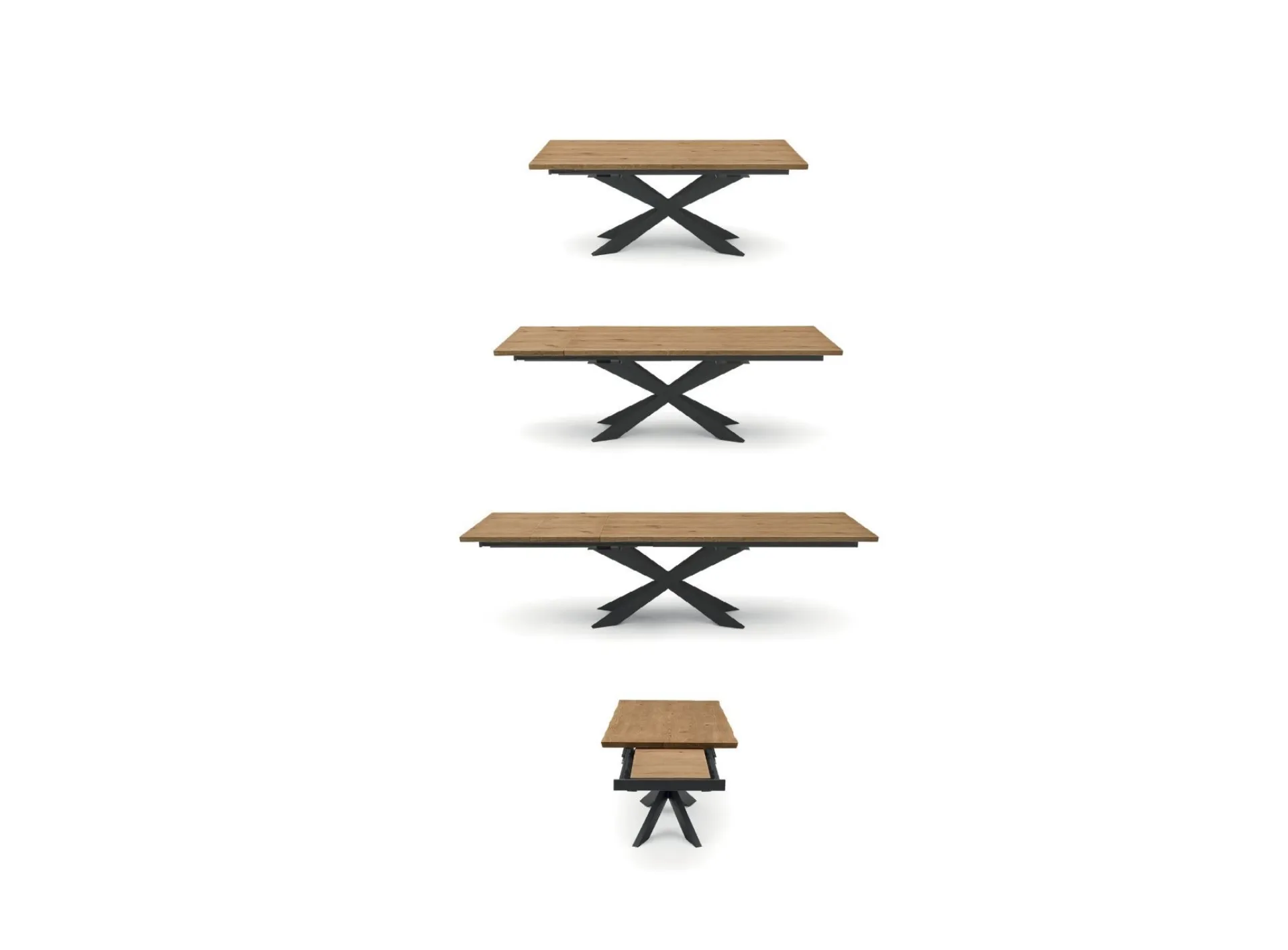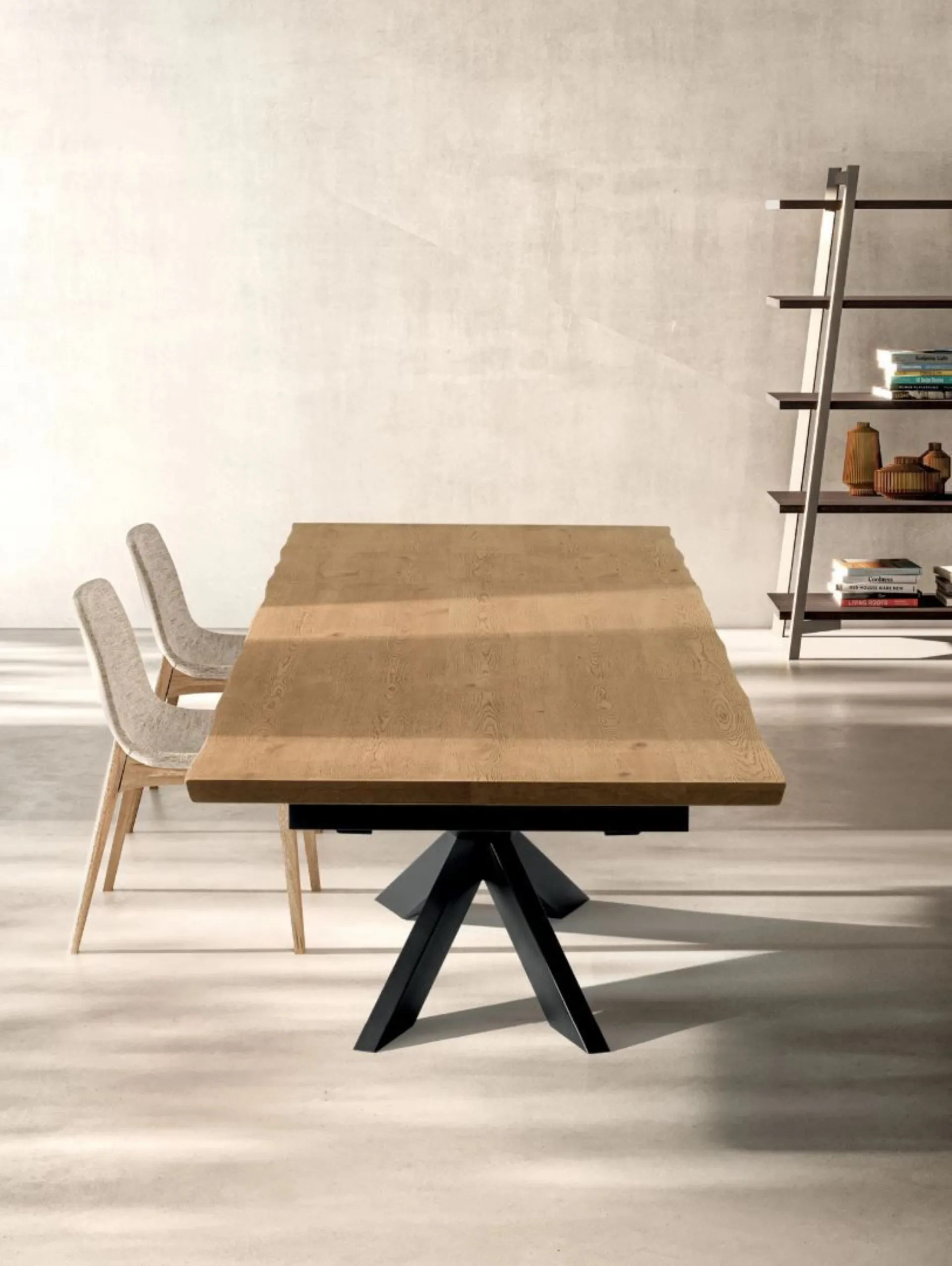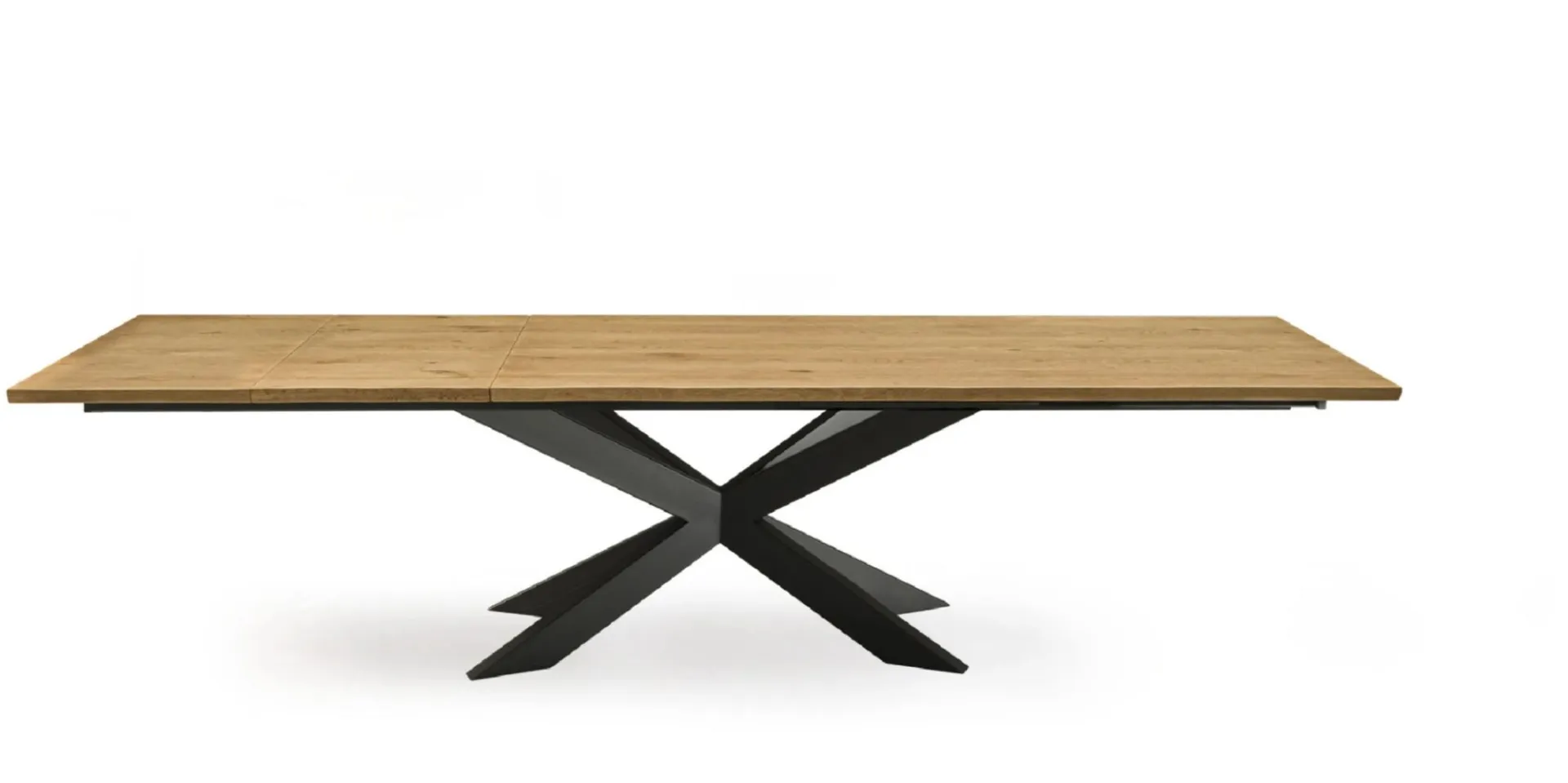 FINITURA: Tavolo allungabile con base in Ferro verniciato Iron Black. Piano e prolunghe in rivere impiallacciato spessore 4 cm finitura Holland Naturale. Bordo irregolare effetto corteccia