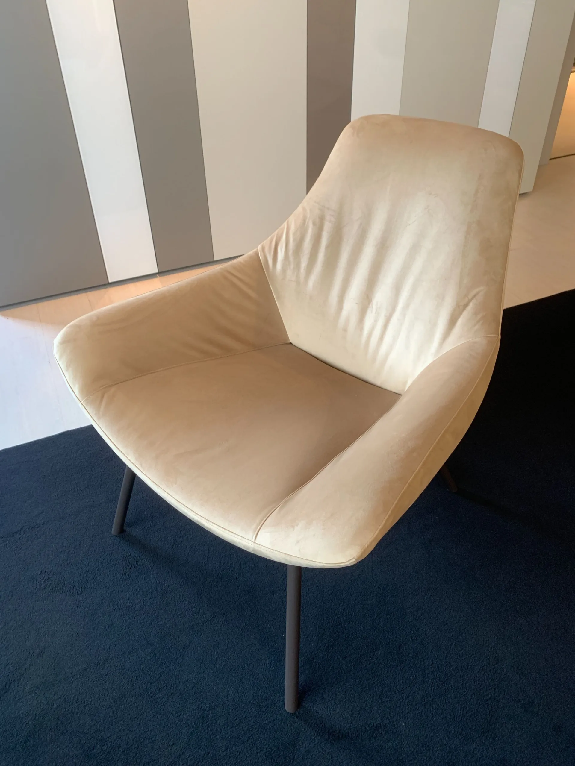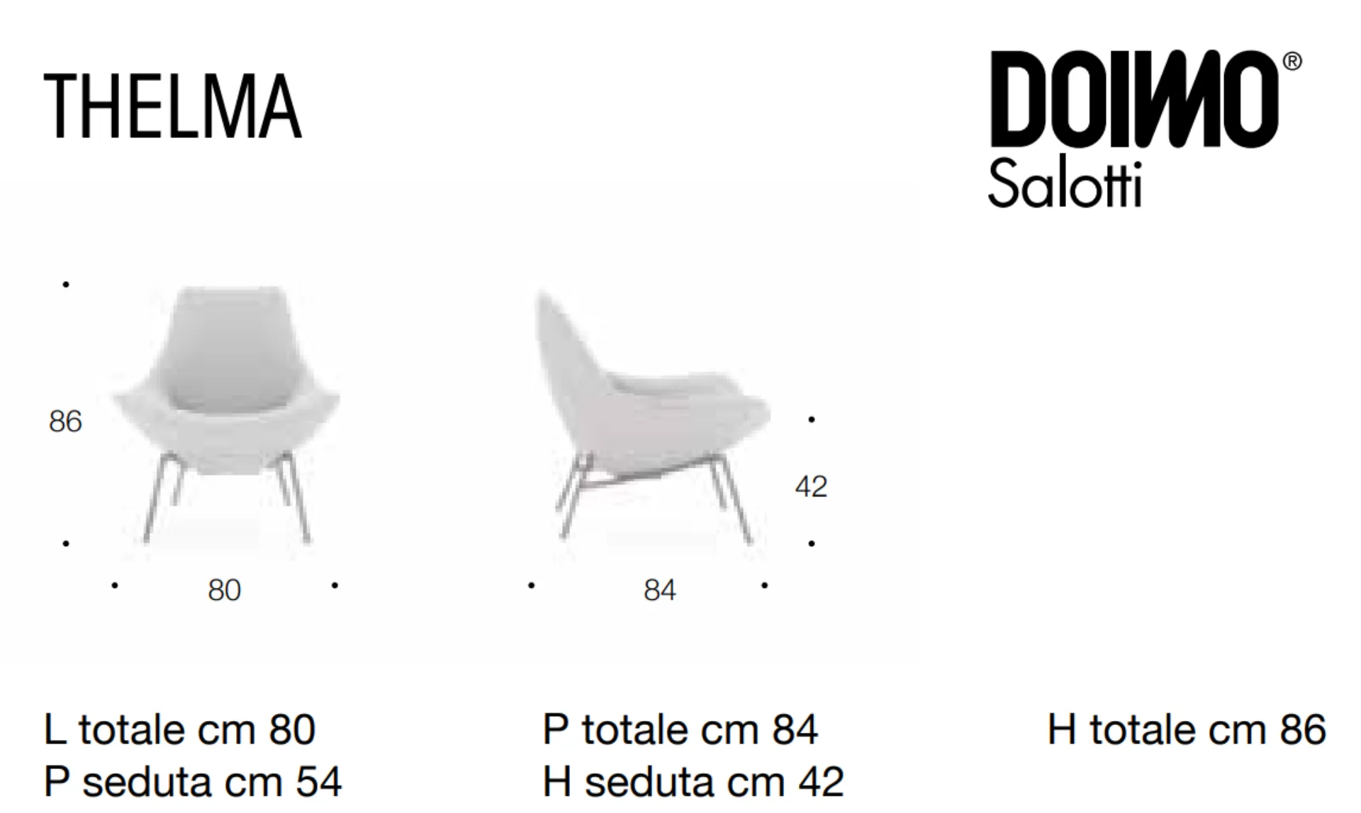 FINITURA: La struttura è realizzata con un telaio in metallo curvato. Poltroncina dalle forme avvolgenti. La seduta è in schiumato a freddo doppia densità 60/70 kg/mc. Lo schienale è realizzato in schiumato a freddo doppia densità 60/70 kg/mc. Thelma è rivestita in tessutoElena 95 CAT.E, ed è completamente sfoderabile.