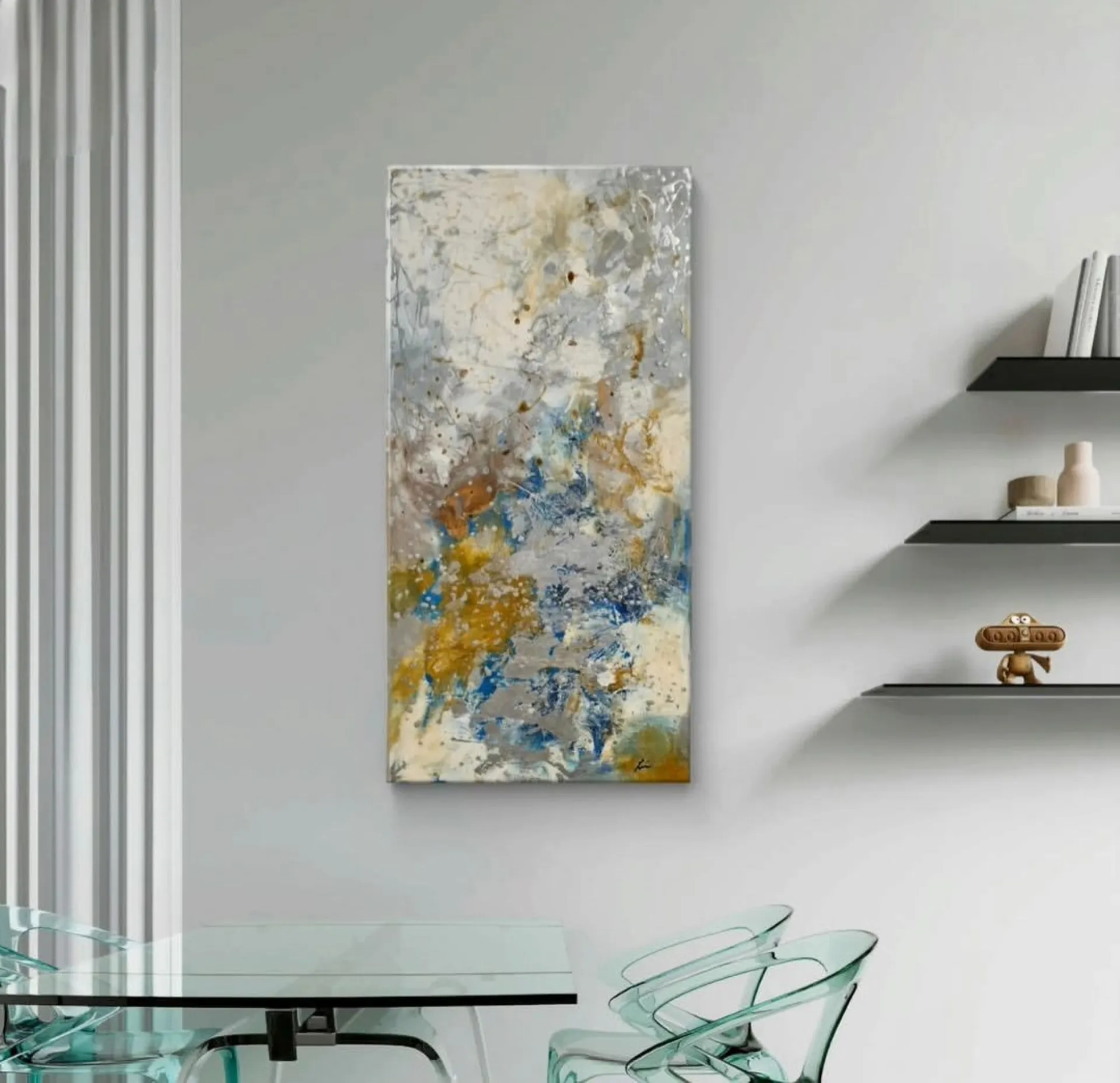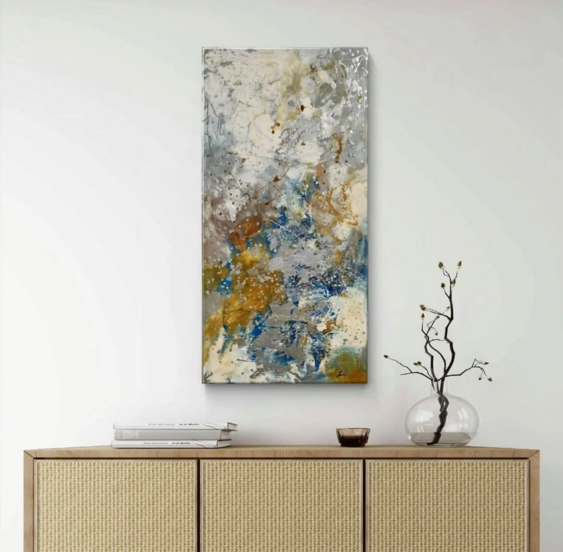 In “Il mio universo”, Imagine Zuin esplora la profondità dell’animo attraverso una danza di colori e materie. Toni di grigio, blu e oro si fondono in un equilibrio dinamico che evoca la vastità del cosmo interiore.