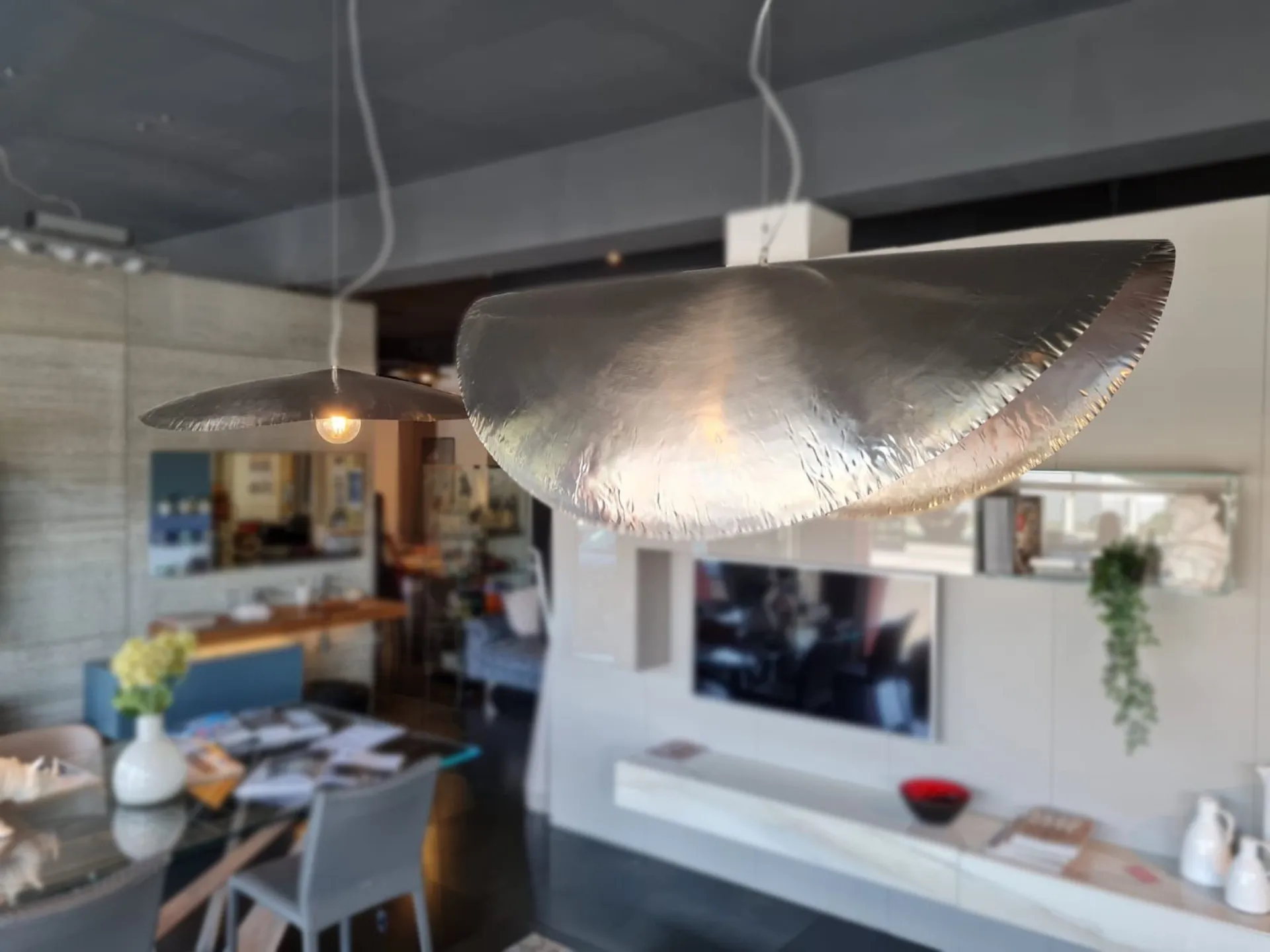 FINITURA: Lampada a sospensione in ottone finitura nichelata martellato. Potenza max. applicabile 18 W, 220 Volt, attacco E 27, (lampada non fornita).