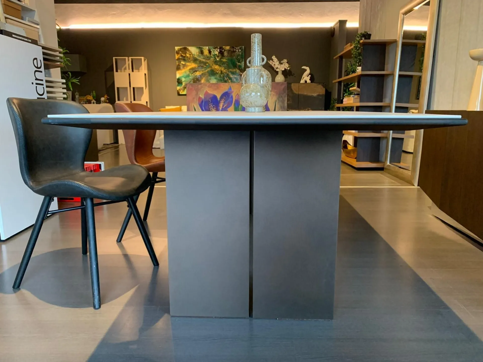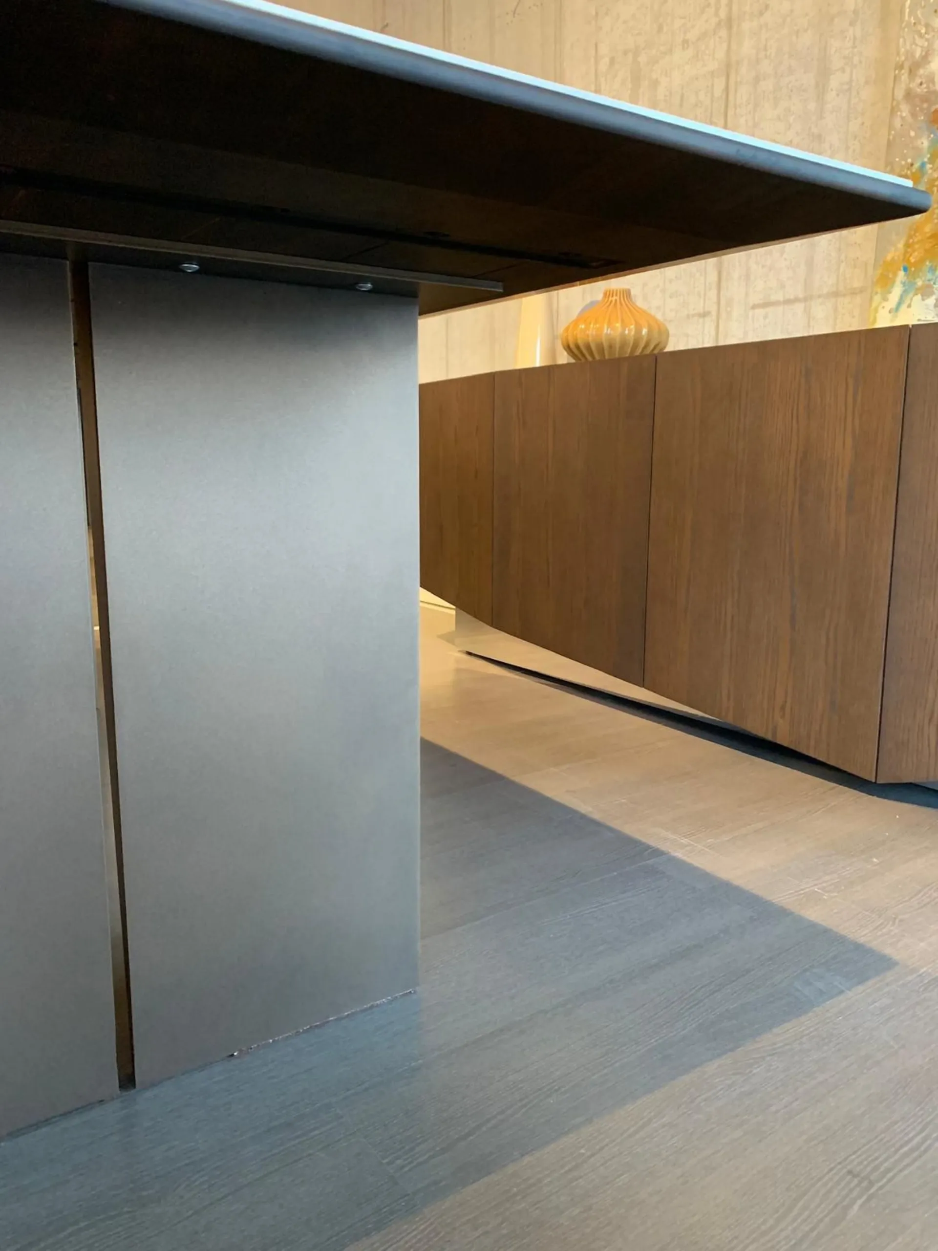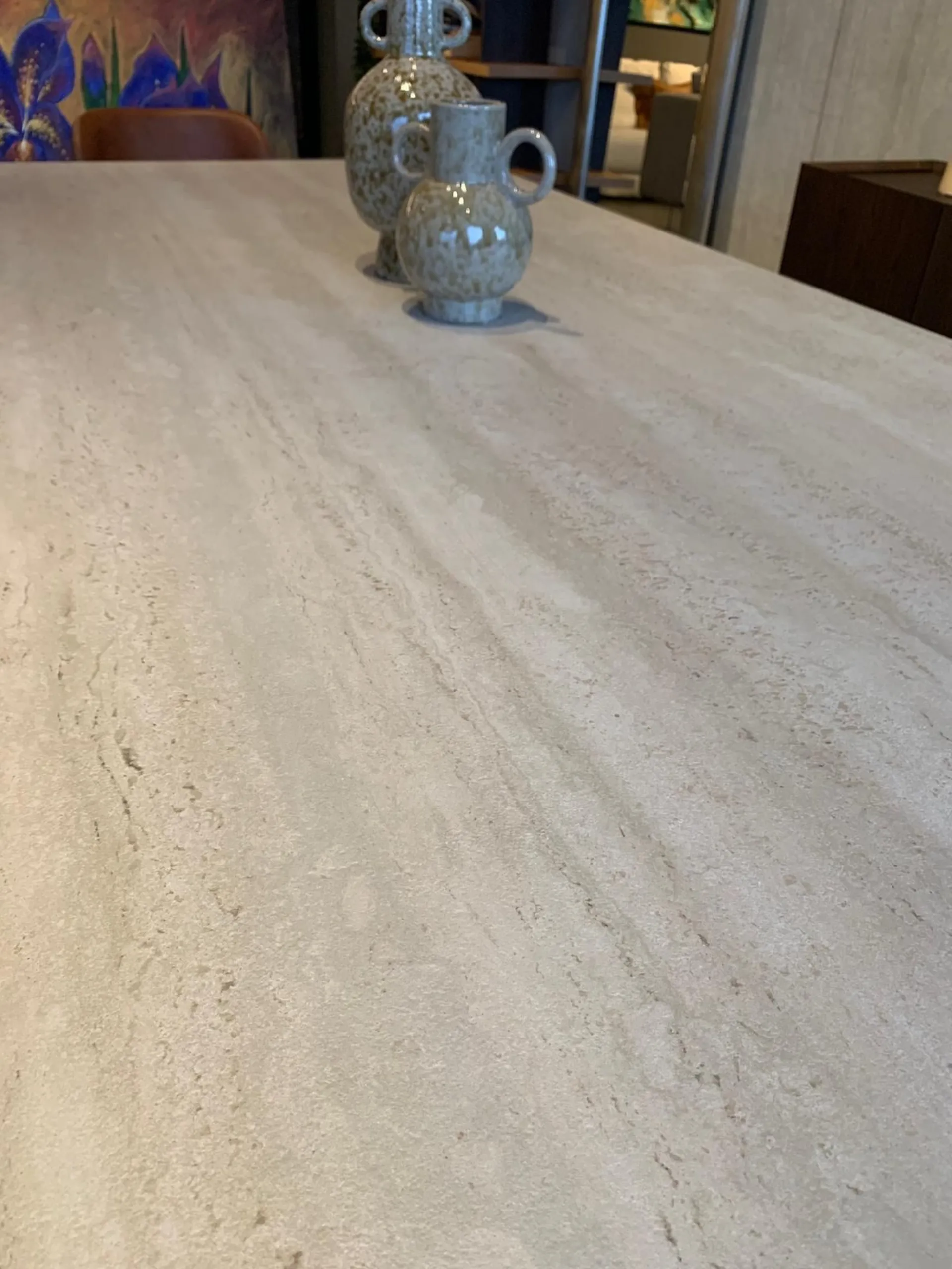 FINITURA: Tavolo rettangolare, bordo sagomato - Supporto piano in legno finitura Dark Brown, Piano in gres finitura Travertino Opaco - Spessore 3.3 cm + 0.6 cm. Gambe Stylo in ferro finitura Bronzo