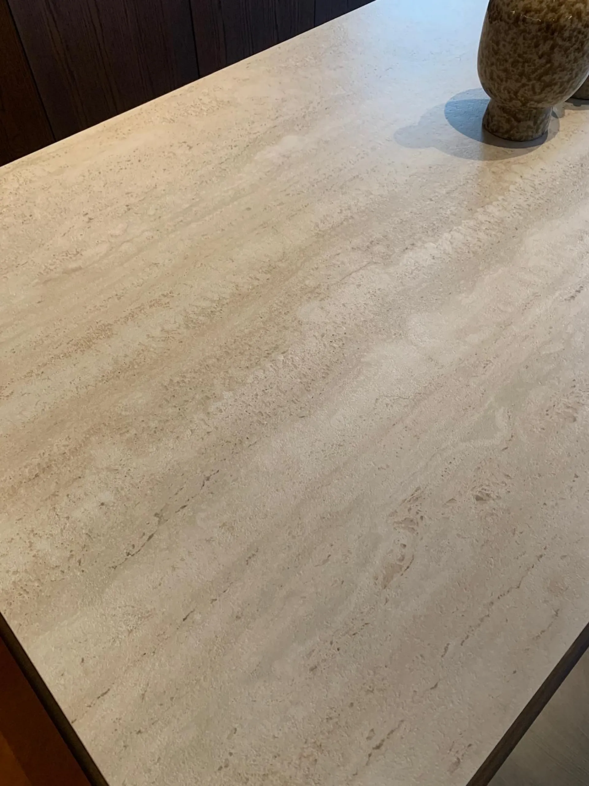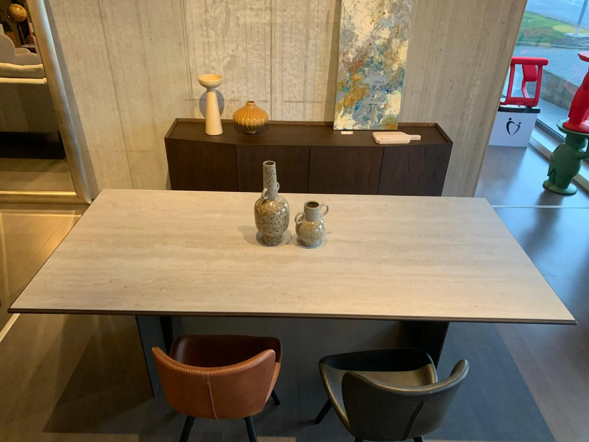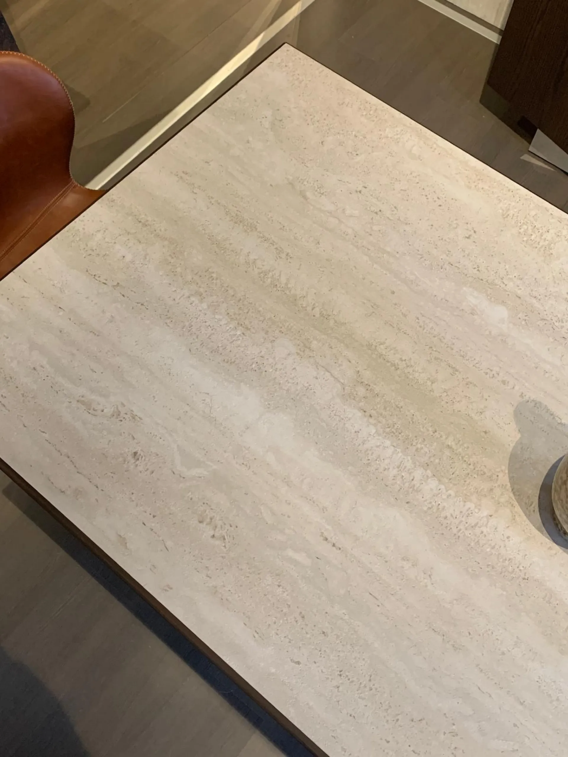 FINITURA: Tavolo rettangolare, bordo sagomato - Supporto piano in legno finitura Dark Brown, Piano in gres finitura Travertino Opaco - Spessore 3.3 cm + 0.6 cm. Gambe Stylo in ferro finitura Bronzo